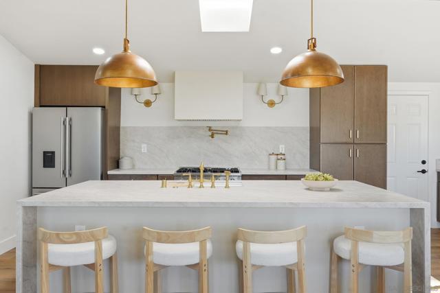 Nestled in one of Serra Mesa’s most sought-after neighborhoods, this fully reimagined 3-bedroom home perfectly blends modern sophistication with natural beauty and luxury. Enjoy beautiful canyon views and thoughtful design in every detail of this open-concept residence. Step inside to discover a bright, airy living space featuring vaulted ceilings, recessed lighting, and a seamless flow between the kitchen, dining, and living areas. The chef-inspired kitchen is a showstopper with its striking honed Perla Vedanta quartz waterfall island, sleek soft-closing custom cabinetry, premium stainless steel appliances, and a professional six-burner cooktop with an integrated hood. Expansive bifold doors open to the patio, creating a true indoor-outdoor living experience—perfect for entertaining or relaxing while taking in the stunning views. The spacious living area is anchored by a modern fireplace and complemented by luxury vinyl plank flooring throughout. Retreat to the elegant large primary suite (Rare for the area) featuring dual closets and a spacious dual vanity bathroom space which includes a custom walk-in shower. Every inch of this home has been upgraded, including a brand-new roof, HVAC system, electrical, and plumbing. Outside, you’ll find a freshly poured concrete patio, low-maintenance synthetic turf, and beautiful landscaping designed for easy living. Additional highlights include dual-pane windows, contemporary fixtures, and a two-car finished garage. Located just minutes to Mission Valley, top-rated schools and major freeways. Perfect for convenience, and lifestyle.