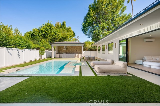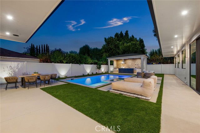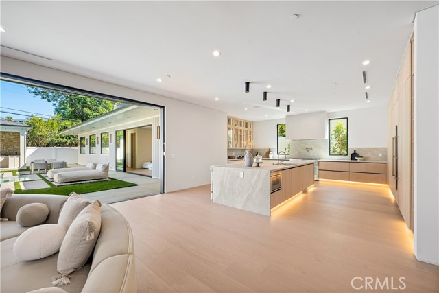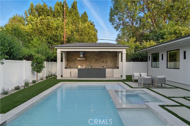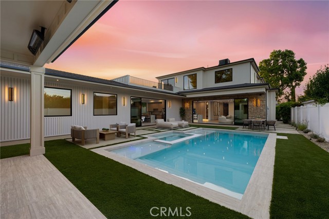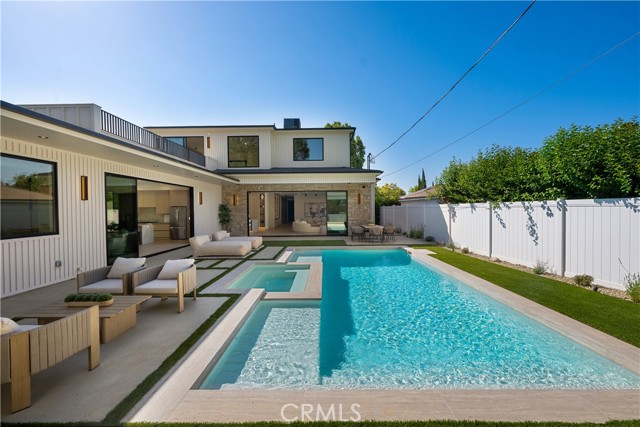Experience an extraordinary newly constructed estate that redefines modern elegance in the heart of Encino. Completed in 2025 by one of the area’s most acclaimed builders, this architectural modern farmhouse is a sanctuary of artistry, design, and comfort. From the moment you arrive, the gated entrance and striking curb appeal set the tone for what lies beyond. Inside, soaring ceilings, a dramatic stone feature wall, and wide-plank European oak floors create a seamless blend of grandeur and warmth. Venetian plaster finishes, designer lighting, and custom millwork highlight the impeccable craftsmanship throughout. The gourmet kitchen is nothing short of breathtaking, showcasing imported porcelain countertops, an oversized island with smart storage, professional-grade appliances, and a wine & beverage cooler. The dining room dazzles with a built-in glass display cabinet with sleek black framing and soft backlighting, a gallery-like feature perfect for luxury dining, the expansive family room centers around a statement fireplace, evoking the serenity of a Tulum resort while capturing the sophistication and relaxed elegance of modern California living.The private backyard five-star retreat includes: sparkling pool & spa, outdoor kitchen with BBQ, bar seating, and a covered patio with heaters, perfect for year-round entertaining. A 2-bedroom ADU offers complete independent living with its own kitchen, bathroom, and living room. With both a private side entrance and sliding doors to the backyard, ideal as a guest house, office, or pool cabana. The main level also features a cinema room designed for the ultimate movie night experience, ensuite guest bedroom, mudroom & a stylish powder room. Ascend the floating staircase, accented by an impressive indoor garden seamlessly blended into the floor design & illuminated with lighting, leading to 4 spacious ensuite beds upstair, including a luxurious primary retreat with a rooftop-style balcony, fireplace, oversized walk-in closet, and spa-inspired bath with soaking tub, dual rain shower, and dual vanities. Additional amenities include a smart home system with speakers, security cameras, alarm, and gated driveway with intercom. Located within the Encino Charter Elementary district and moments from Ventura Blvd’s premier dining and shopping with effortless freeway access, this estate embodies the best of design, lifestyle, and location. This is not just a home, it’s a statement of elegance, artistry, and elevated living.