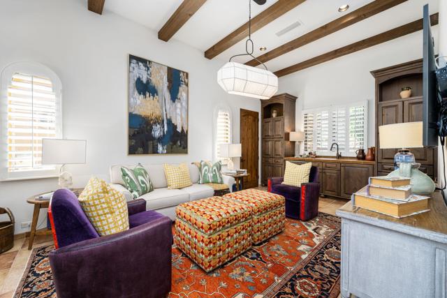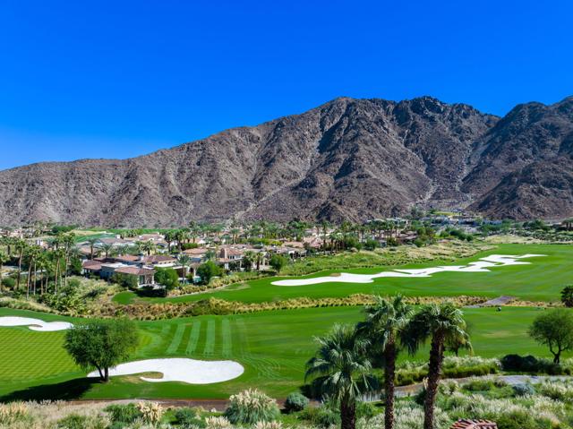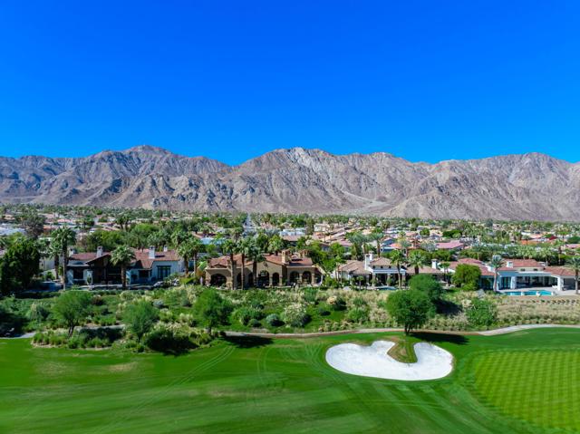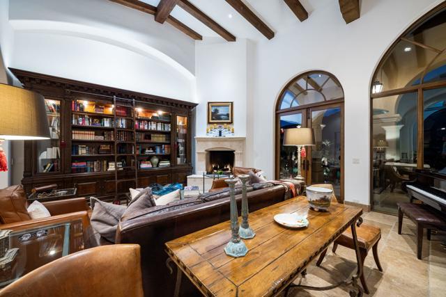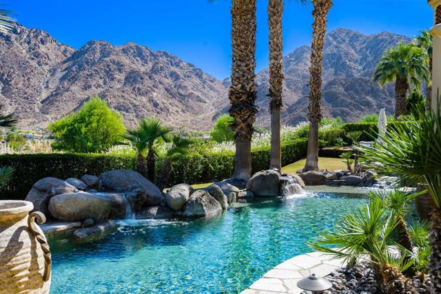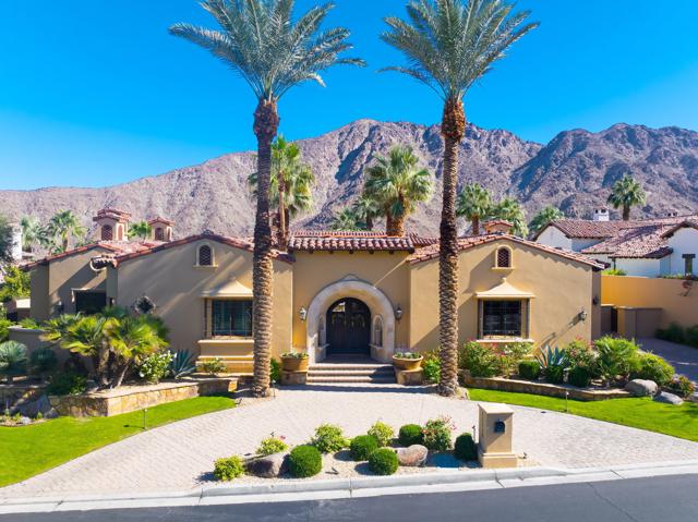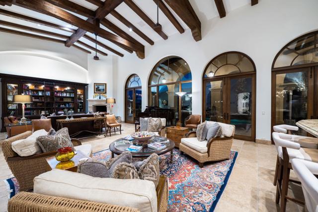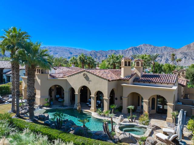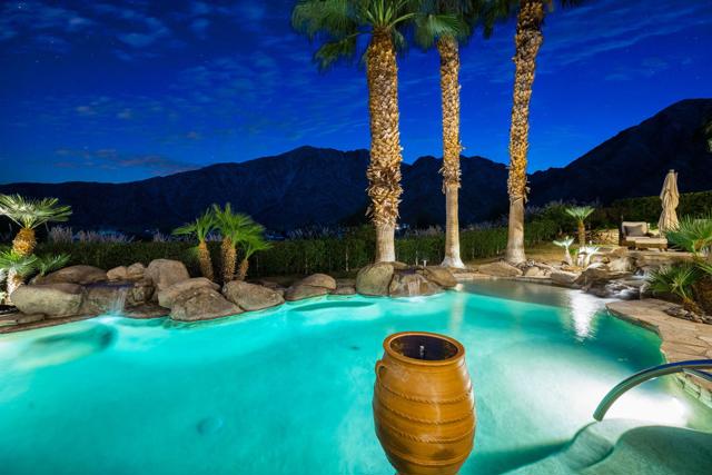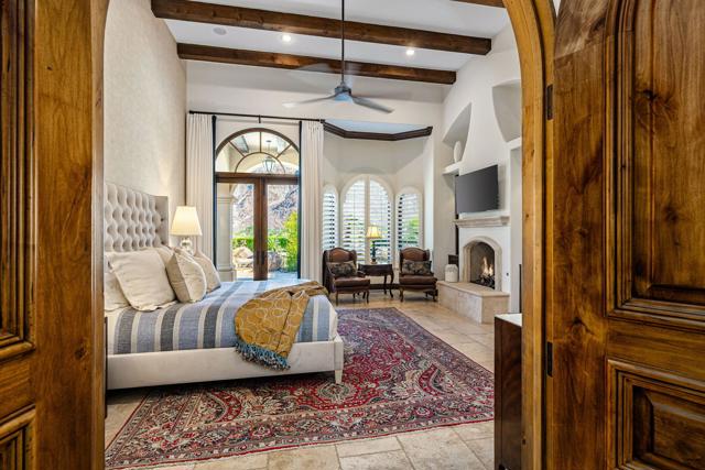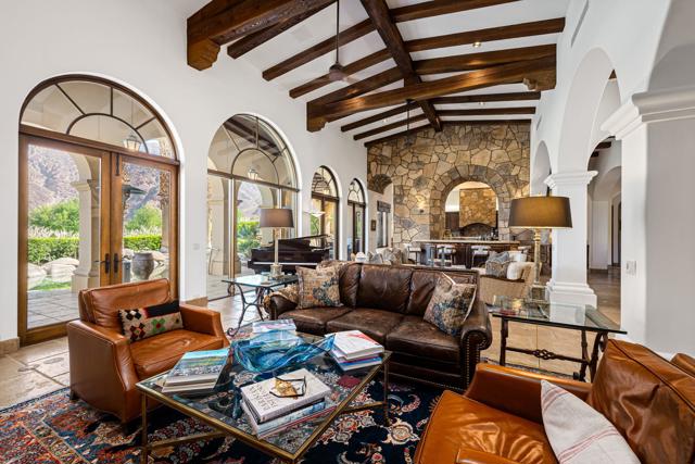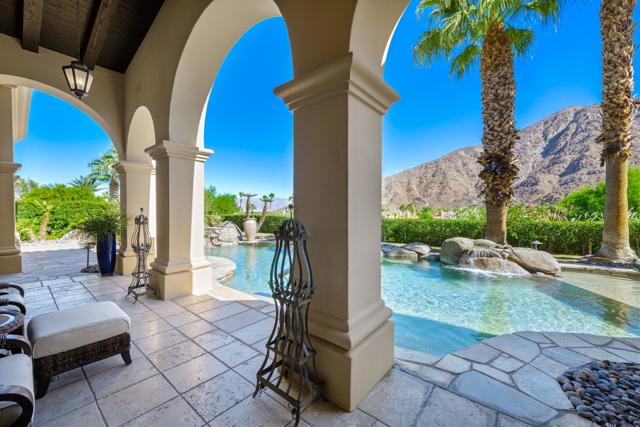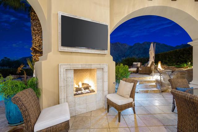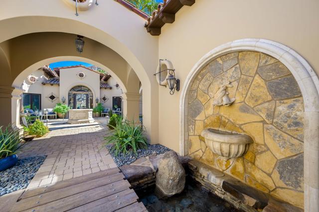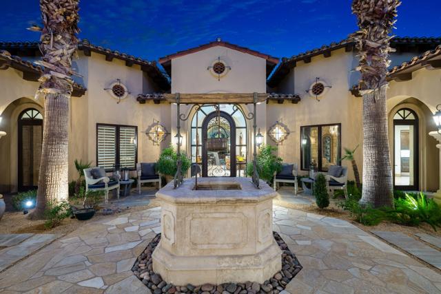 Panoramic mountain and fairway views from one of the best lots in Tradition! The impressive entrance is like no other. Enter through handsome Iron gates, over an arched bridge, expansive courtyard with architectural features and behold a magical view of the Santa Rosa Mountains. This light and bright home has everything you could imagine including a formal dining room, wine cellar, dual offices (4th bedroom set up as office with queen murphy bed), radiant heat, central vacuum system and much more. The perfect family home with 4 bedrooms including a casita with living room. Highest quality finishes, rich millwork and craftsmanship throughout, including hewn hardwood beams, gorgeous natural stonework & gourmet kitchen with premium appliances. Luxurious primary suite with cozy fireplace and sumptuous bath with dual vanities, dual closets, warming towel drawer, beautiful shower and jetted soaking tub. Located on the 12th fairway with stunning pool, flowing stream, built-in BBQ, and outdoor dining. Multiple outdoor spaces make idyllic settings for upscale social gatherings or private relaxation and blend seamlessly with the interior. Indoor and outdoor Sonos sound system included. There are two outdoor fireplaces and a fire pit. Welcome to a lifestyle of luxury, comfort and elegance at Tradition. Built by one of the Desert's finest contractors, Cal-Tech Development, this home is offered furnished per inventory.