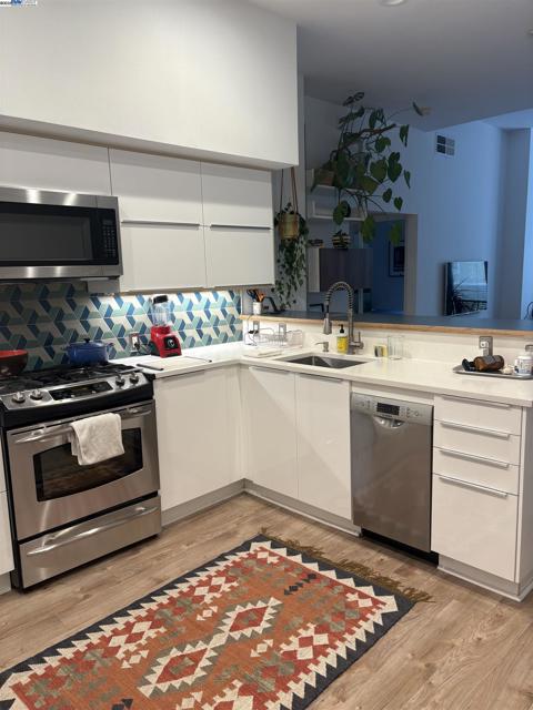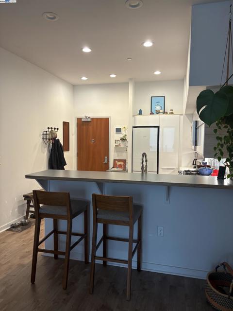 Rare 4th floor condominium with 11 ft ceilings. Gives a whole new feeling to the space. Remodeled in 2019 with upgraded kitchen to include cabinets, backsplash, countertop, refrigerator, dishwasher, microwave and hightop counter. It is original and unexpected. Great light, beautiful upgraded laminate flooring, recessed lighting and ceiling fans. Washer and dryer in-unit, large bathroom with shower over tub. Added shelving included. Water, gas, sewer, trash, and HIGH-Speed Internet all included. Along with Courtyard with BBQ, Community and Package Room, Fitness Room and Secret Dog Run and one Parking Space with Storage. Very close to BART, Lake Merritt and all different restaurants and coffee shops. Professional pictures coming soon!