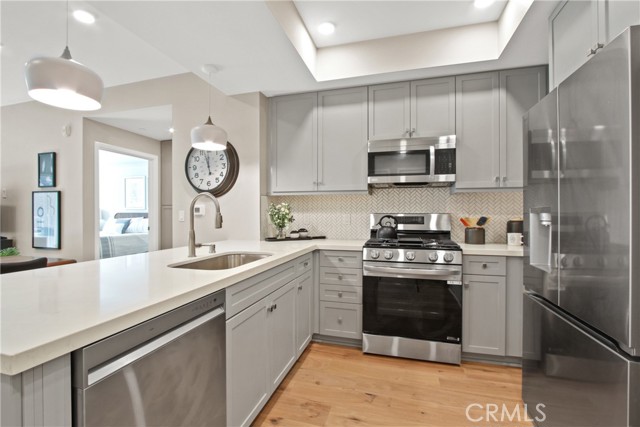 La Sevilla is a brand-new collection of upscale single-level condominiums in the prestigious Rolling Hills Estates, seamlessly combining comfort, simplicity, and modern design. Plan F features an open concept living and dining area that flows effortlessly onto a private balcony, creating a perfect blend of indoor relaxation and outdoor enjoyment. The home showcases elegant finishes, including wide-plank hardwood flooring throughout, quartz countertops, a full tile backsplash, and a premium stainless-steel appliance package with a French-door refrigerator, built-in microwave, gas range with AirFry, and dishwasher. The spacious primary suite includes a luxurious bathroom with a glass-enclosed shower, quartz counters, designer porcelain tile, and stylish stainless-steel accents. Residents have access to a grand courtyard with inviting sitting areas and a dual fireplace, as well as a modern fitness center, remote-work lounge, community room, and a barbecue area with a firepit—ideal for gatherings and leisure. Situated on the scenic Palos Verdes Peninsula, La Sevilla offers the tranquility of a high-end neighborhood combined with exceptional walkability. Just steps away are Peninsula Center shops, the public library, grocery stores, coffee shops, and a variety of local restaurants. Additionally, the community is minutes from scenic hiking trails and the stunning beaches of Palos Verdes, making it easy to enjoy outdoor adventures and coastal beauty.