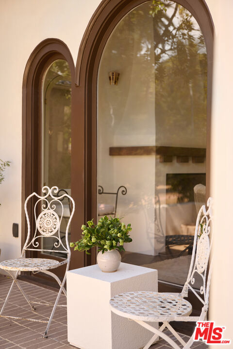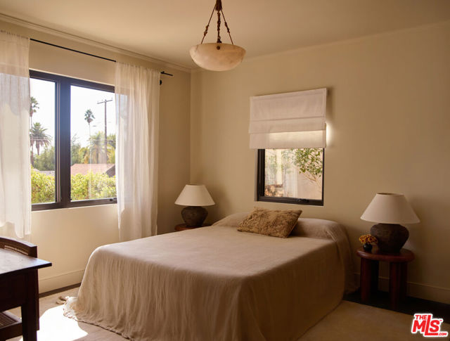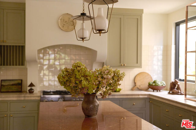 Set against the dramatic rise of the San Gabriel Mountains and just moments from Pasadena's storied Bungalow Heaven, 1764 E. Orange Grove is a rare expression of early 20th-century Spanish Revival charm. Thoughtfully revived through a year-long restoration by Studio Marrant, this home is not simply updated, but reawakened: a celebration of craftsmanship, materiality, and atmosphere. A meandering path through mature rosemary and native plantings leads to the coved ceiling living room, where a newly reconstructed plaster fireplace anchors the space. Carefully restored arched wood windows, original to the 1920s construction, frame mountain silhouettes that shift in tone throughout the day, turning rose-colored at dusk. Light dances across curated vintage and custom fixtures, creating a warm, grounded serenity that carries throughout the home.The dining room flows into a kitchen inspired by European countryside sensibilities, an elevated yet effortless gathering space. Custom cabinetry and a gracious rojo alicante marble island are complemented by a suite of refined fixtures and appliances including Bertazzoni range, Fisher & Paykel refrigerator, and Rohl brass hardware. Handmade tile, honed stone, and bespoke carpentry lend the room a timeless, lived-in elegance. Two bedrooms line the main hallway, offering generous closet space. The ensuite primary bath evokes a Mediterranean retreat: a vintage Barovier & Toso pendant casts a soft glow over a deep soaking tub, surrounded by custom oak cabinetry and hand-applied concretta plaster. A second set of Pinky's iron doors opens out to an expanded patio with ORCA pavers and custom ironwork, a place designed for slow mornings and evening aperitivo. Beyond, follow a stone pathway through citrus and pomegranate trees to raised garden beds and a detached garage with alley access, offering opportunities for a studio, ADU, or workshop.Nestled in one of Pasadena's most beloved and architecturally rich neighborhoods, and only minutes to Woon, Millie's, Deluxe 1717, verdant parks, and the historic charm of Old Town, this home stands as a testament to considered design and enduring craftsmanship. A soulful home to be lived in slowly -- rooted in history, shaped with care, and ready for its next chapter.