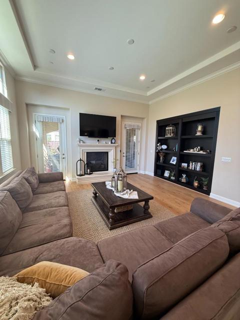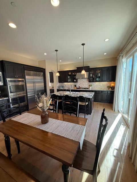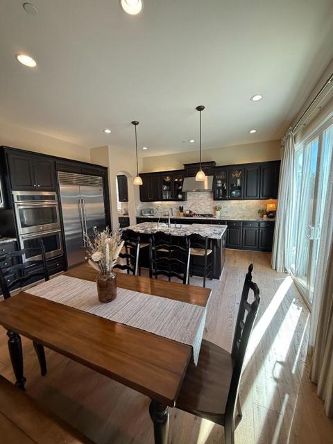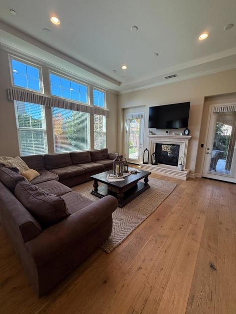 This elegant 5-bedroom, 4.5-bath home offers 3,238 sq ft of beautifully designed living space, blending luxury and functionality throughout. The inviting entry opens to spacious living and dining areas with Monarch hardwood floors and abundant natural light. The gourmet kitchen features granite countertops, stainless steel appliances, a Sub-Zero refrigerator, and a convenient butlers pantry. A downstairs bedroom with an en-suite bath is perfect for guests or multi-generational living. The luxurious primary suite includes a spa-like bathroom and a huge walk-in closet. A charming courtyard connects to the detached ADU ideal for extended family, a home office, or rental income. The expansive backyard is an entertainers dream with a covered patio, dual fireplace, built-in BBQ, and a nice-sized grass area for outdoor dining and play. Additional highlights include an oversized two-car garage wired for an EV charger, ample storage, and beautiful curb appeal. Enjoy resort-style living with HOA amenities featuring three private parks, tennis, pickleball, and basketball courts, a kids playground, and scenic walking trails.
