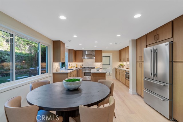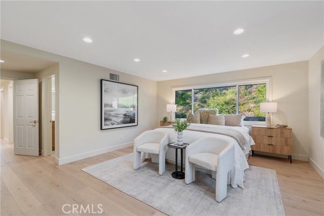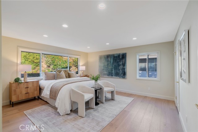 Welcome to this beautifully reimagined Calabasas home, offering 2,739 sq ft of curated design and contemporary comfort. Featuring 4 bedrooms and 3 bathrooms, this property has been fully designer-redone with a focus on craftsmanship, detail, and livability. The light-filled interior showcases new wide-plank white oak flooring throughout and a stunning thin-shaker white oak kitchen with stainless steel appliances, a designer tile backsplash, and Taj Mahal quartz counters. A striking wine feature wall adds a touch of sophistication and creates a perfect focal point for entertaining. Each bathroom has been individually styled with its own aesthetic, featuring backlit mirrors, custom glass shower doors, and premium finishes for a true spa-like experience. The spacious primary suite includes a dual vanity, large walk-in closet, and a relaxing retreat atmosphere. Additional highlights include an updated fireplace, recessed lighting throughout, a convenient downstairs bedroom or office, abundant storage, and fresh paint inside and out. Step outside to a beautifully refreshed landscape with new plantings and greenery, offering inviting outdoor spaces to relax or gather. The home also features a brand-new roof and new hardware throughout making it truly turnkey and ready to enjoy from day one. Set within the award-winning Las Virgenes School District, this Mulwood gem blends refined design with modern functionality, offering a rare opportunity to move into one of Calabasas’ most desirable neighborhoods.