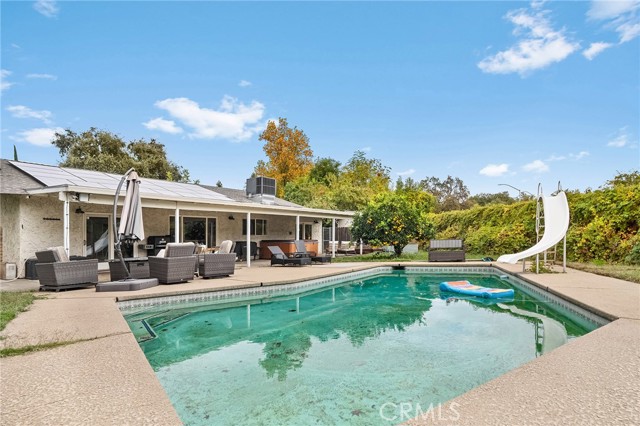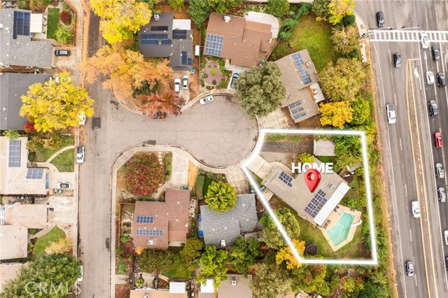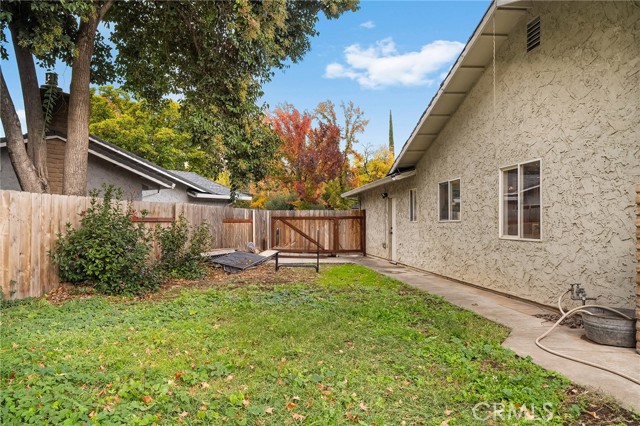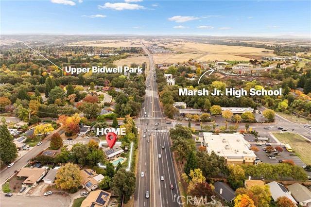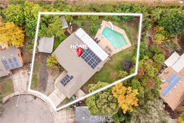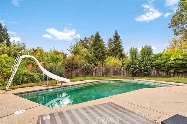 Nestled on a cul-de-sac just blocks from Lower Bidwell Park, this beautifully updated 4-bedroom, 3-bath home with an office offers the perfect blend of comfort, functionality, and charm. Over the past few years, nearly every surface has been refreshed — from new drywall, texture, and paint throughout to all-new lighting, fixtures, and appliances. Step inside to an inviting, well-designed floor plan with the bedrooms privately situated on one side and the main living spaces on the other. The spacious living room features warm laminate flooring, a classic brick fireplace, and abundant natural light with easy access to the backyard. The kitchen offers generous counter space, new appliances, and a large granite single-basin sink. The bathrooms have been stylishly updated with new tile and double sinks in both the hall and main bathroom, while three of the four bedrooms feature new plush carpet. Behind the scenes, the home has received major system upgrades including a new HVAC system, tankless water heater, added insulation, and solar panels with a new inverter for energy efficiency. The backyard is an outdoor retreat — complete with a large covered patio, mature fruit trees, a spacious lawn, and an in-ground pool with a slide for summer fun. A detached secondary garage with a roll-up door makes an ideal workshop, complemented by an additional storage shed. Located just minutes from Chico’s parks, trails, schools freeway access, and downtown, this move-in ready home truly checks all the boxes!