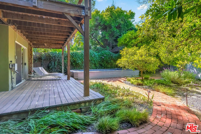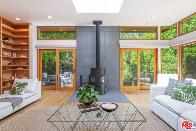 The property is used as a single family home with ADU. Walled and gated compound with stunning architecture on parklike grounds of over 10,000 sqft. Enter through gates to a large motor court and main house. The 3 bedroom 2 bathroom main house has gorgeous wood floors, tall ceilings with skylights and windows that flood the space with natural light. The spacious living room has a floor-to-ceiling built-in book-shelf, architectural fireplace, skylight and glass doors to the outside. The open concept kitchen with eat-in counter, stainless steel appliances, including a new refrigerator, stone countertops, maple wood cabinets, wine fridge and walk-in pantry. The primary bedroom has a large skylight and very substantial custom walk-in closet. The gorgeous en-suite primary bathroom is newly remodeled with separate stand-alone tub, glass-enclosed steam shower and dual sinks. The remaining two bedrooms in the main house are a great size. The private backyard is surrounded by greenery. A secondary structure has an upstairs guest apartment with living area, kitchen, separate bed, bath, & large terrace with a garage below. Downstairs there is a gym with separate bathroom. All of this with a pool, multiple decks, grassy yard, fruit trees and endless options for outdoor enjoyment. Close to the best restaurants, shopping and entertainment in Sherman Oaks. The square footage breakdown per measurement is as follows: Main House approx. 2,493 sq ft, Guesthouse approx. 665 sq ft, Gym & Bathroom 206 sq ft. The property is used as a single family home with ADU.