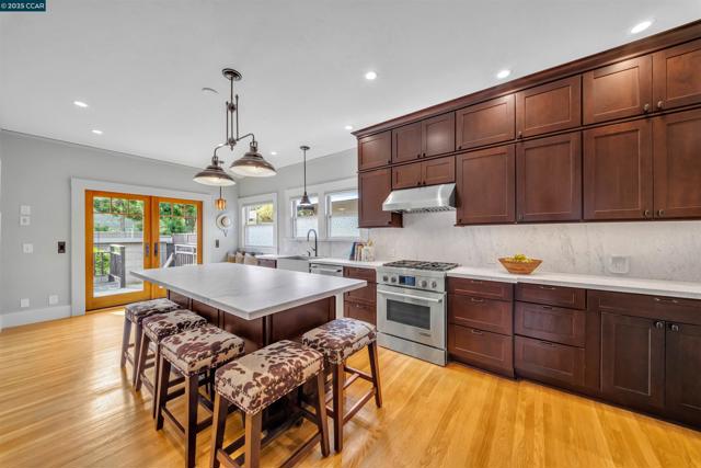 On the market for the first time in almost 40 years! This meticulously maintained craftsman home has been beautifully restored with refinished woodwork, hardwood floors, built-ins with leaded glass, coved ceilings as well as remodeled kitchen & bathrooms, upgraded electrical & plumbing. Entering this charming home you are greeted by a cozy foyer with bench seat and leaded glass pocket door. The light filled living room with wood burning fireplace opens to expansive dining room with built-in hutch and wainscoting. Bedrooms with gleaming hardwood floors are located adjacent to remodeled bathrooms boasting radiant heated flooring, luxurious primary bathroom has soaker tub and custom walk-in shower. Gorgeous gourmet kitchen remodeled in a timeless style leads out through french doors to a spacious deck & backyard ideal for entertaining, gardening or relaxing. ADU possibilities with sizable garage & attached studio located at the rear of the property following a lengthy driveway. Located in one of Alameda's most coveted neighborhoods, near popular Franklin Elementary School which is across from swimming pool, tennis courts & play structures in Franklin Park. Moments to cafes, locally owned stores or a stroll to the beach! (Ferry to SF from terminals on either end of town.)