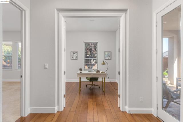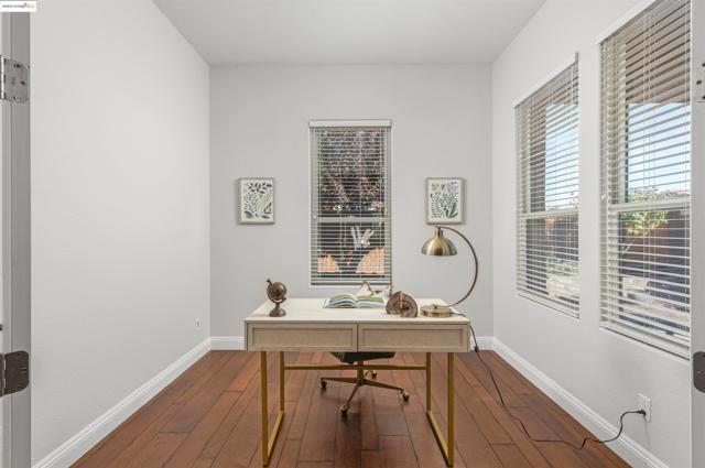 Beautiful single-story home in the desirable Trilogy at The Vineyards 55+ gated community. This well-maintained home offers 2 bedrooms, 2 bathrooms, and a private office/den with French doors, perfect for hobbies or remote work. The open-concept, eat-in kitchen features a cozy breakfast nook, small island, pantry, quartz countertops, espresso cabinetry, and stainless steel JennAir appliances, including a 5-burner gas cooktop. Laminate wood flooring enhances the main living areas, with tile in the baths and carpeted bedrooms for added comfort. The primary suite includes a walk-in shower with seating and dual vanities. Enjoy a private backyard on a corner lot with a covered patio, stamped concrete, and space for gardening or outdoor dining. Owned solar, tankless water heater, and energy-efficient upgrades help keep utility costs low. Enjoy resort-style living at Club Los Meganos, featuring a restaurant, spa, pools, gym, wine barn, pickleball, tennis, social clubs, and more!