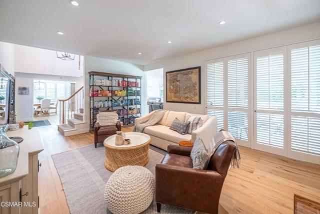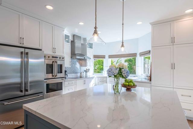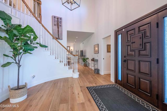 Exquisite Mediterranean Style Estate in highly desirable Morrison Ranch. Nestled on a beautiful and quiet street, this stunning home embodies elegance, comfort, and refined California living. Excellent curb appeal with meticulous landscaping and fresh new exterior paint in 2023. Featuring a wonderful open floor plan with one bedroom , adjacent bath and laundry on the main level and three additional bedrooms upstairs, this home offers both versatility and sophistication. A dramatic newer high end solid wood front entry door and foyer with a sweeping winding staircase and rich California Classic Mediterranean engineered hardwood floors sets the tone for the rest of the home. Exceptionally gorgeous, fully remodeled and expanded gourmet kitchen (2020) is a true showpiece, featuring custom cabinetry, quartz counters, LED lighting, GE Monogram appliances, center island with breakfast bar and ample space for cooking and entertaining. The picture window in the dinette area has been enlarged to harmoniously blend the window size on the opposite side of the fireplace. The kitchen opens to a large family room with fireplace, built-in's and opens to an enchanting, covered patio that overlooks the pool. Lovely formal dining area. This unbelievably beautiful home is warm and inviting with an abundance of natural light that fills nearly every space throughout. The luxurious formal living room with fireplace has been reconfigured from the original model with stepdown and now features raised / even floors which enhance its desirability and create an effortless flow throughout. The primary suite serves as a serene sanctuary, complete with a sitting room / retreat or office with gorgeous mountain views, large walk-in closet, and luxurious bath. The secondary bedrooms are generously sized with one featuring mountain views. Outdoors, the lush and meticulously landscaped grounds offer rich and vibrant gardens, a striking magnolia tree, and majestic palms that frame the pool, spa, and spacious grassy area, creating a Santa Barbara-esque resort ambiance. With hedged privacy and mountain views, the setting is nothing short of spectacular. Additional highlights and amenities include: New pool heater and filter (2025) New AC UNIT (2021), New Water Heater (2023), Smart Operating System (Aqualink) (2023), Smart garage door opener (2024), NEW dishwasher (2025) with transferable 5 year warranty, New vinyl gate (2021), custom plantation shutters and window coverings, recessed lights, new smart thermostat for upper floor (2025), custom skirtboard on stairs, new carpet on stairs and lower bedroom (2025), New ground floor hardware on all ground floor doors (2025), New paint in upstairs and lower bedrooms (2025) New paint in ground floor with remodel (2020), drought resistant flower beds on pool patio (2020) and added second electrical panel with room for future updates and solar. Located within the award-winning Las Virgenes School District, this exceptional property blends timeless design, modern upgrades, and an ideal location, making it the perfect place to call home. Don't miss your chance to live in the highly sought-after Morrison Ranch Estates.