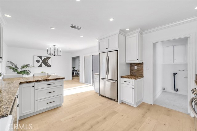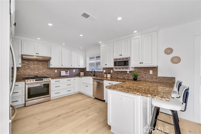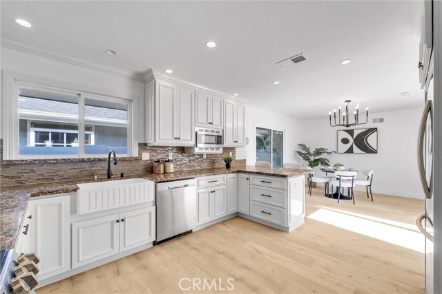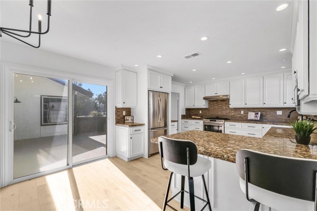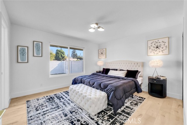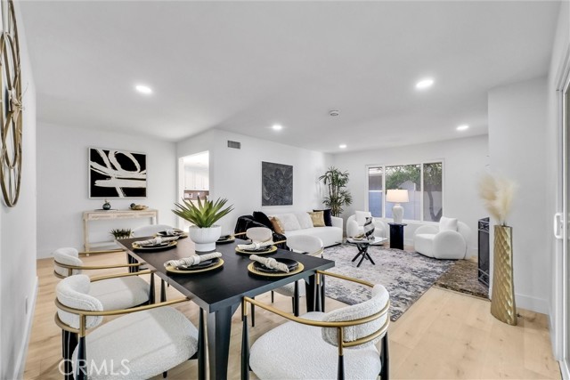 Welcome to this exceptional four-bedroom, two-bathroom home nestled in the coveted Villa Park community, where sophistication meets suburban serenity. Upon approach, elegant double walnut doors herald your arrival into 1,746 square feet of thoughtfully designed living space adorned with lustrous light oak luxury vinyl flooring that flows seamlessly throughout. The heart of this residence showcases a gourmet kitchen that would make even the most discerning chef swoon, featuring gleaming granite countertops, premium stainless steel appliances, and an abundance of storage solutions for the culinary enthusiast. The inviting living room, anchored by a charming fireplace, provides the perfect backdrop for both intimate gatherings and grand entertaining. The primary bedroom serves as a tranquil retreat, complete with mirrored wardrobe doors and an attached private bathroom. Three additional bedrooms, each equipped with mirrored wardrobe doors, offer flexibility for family living, home offices, or guest accommodations. Throughout the home, recessed lighting and brushed gold hardware elevate the aesthetic with contemporary elegance. Practical amenities abound, including an indoor laundry room, attached two-car garage, efficient tankless water heater, and central air and heating systems for year-round comfort. The location proves equally impressive, with proximity to highly-regarded Villa Park Schools and convenient access to Ralphs Fresh Fare for daily necessities. Villa Park High School sits nearby, while Grijalva Park offers recreational opportunities. The Orange train station provides excellent transportation connectivity. This residence perfectly balances modern luxury with everyday functionality, creating an ideal sanctuary for contemporary living.