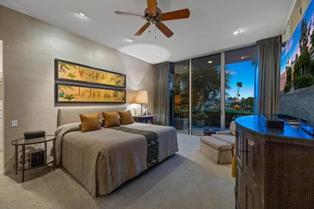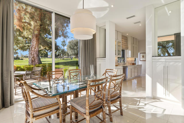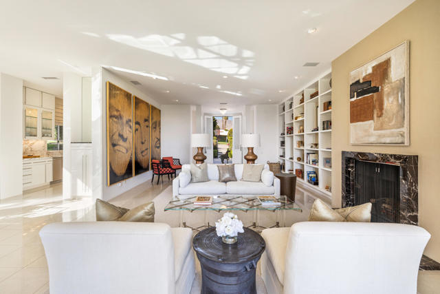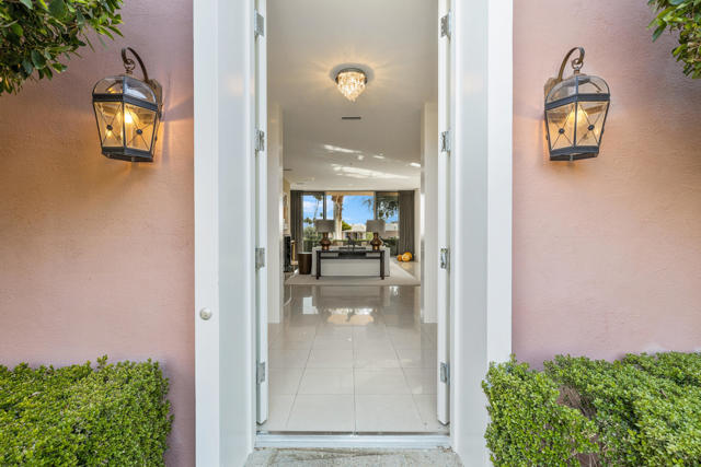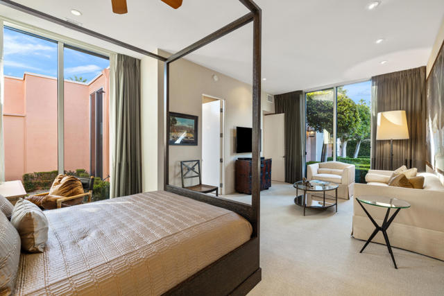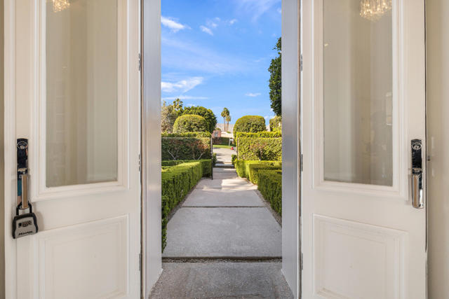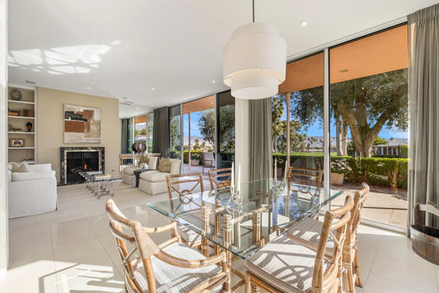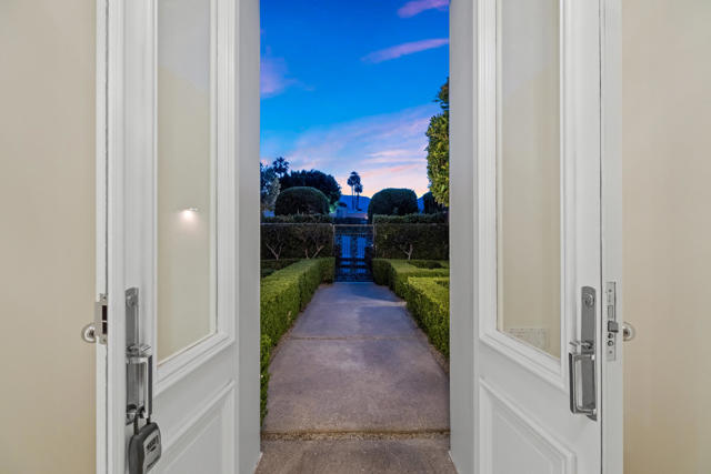 Open the intricate black wrought iron gate of the private courtyard and ascend into a world of peace, tranquility, charm, and timeless Marrakesh style. The English Garden of boxwood hedges is enchanting, and you look on to the magnificent welcoming 10 foot front door that takes you into a home that reigns in beauty. This immaculate 2 bedroom home with 2 baths and powder room, w 2,268 sq. feet, has a great room that is encircled with white glistening flooring, soaring ceiling to floor windows, a classic fireplace and a built in wall of understated shelving that balances the room. The chandelier in the dining room that overlooks the golf course hangs with splendor. The kitchen flows from this room making entertaining easy and seamless. The impressive kitchen has white marble counters and backsplashes, well appointed appliances and reflects the natural light from the windows and doors. The generous primary suite overlooks the golf course, with an ensuite that will have you thinking you are at a spa, with its stand-alone oval bathtub, marble counters and spacious shower. There is a huge guest suite, that is also an ensuite, this home allows for a tremendous amount of access from the door walls to the gorgeous grounds and patios, making one feel they are at one with nature and exudes complete serenity. The patios are extensive and surround the home with a BBQ for alfresco dining under the stars.