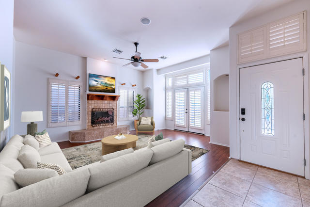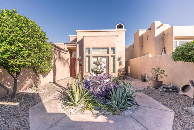 Nestled in the picturesque foothills of La Quinta Cove, this adorable 3-bedroom, 2-bath adobe-style residence blends coziness and charm with an unbeatable location. Surrounded by the stunning mountain views and just a short stroll away from the well-loved La Quinta Cove Trail, it's the ideal retreat for those in search of the peace and calm of desert living.From the moment you arrive, enter the front courtyard through the arched wooden entry door with distinctive architectural details. The entryway is private yet inviting!Step into the backyard to discover breathtaking views of the Santa Rosa Mountains, encased by the sparkling, clean, recently re-surfaced pool and spa. Relish a quiet morning coffee or entertaining guests at sunset; this outdoor space offers the ultimate combination of relaxation and style.Walk inside, and the open-concept living area boasts high ceilings, abundant natural light, and charming Southwestern details, such as exposed wood beams. A cozy fireplace anchors the space, adding warmth and character. A new, never-used refrigerator, washer and dryer are included with this move-in ready home. Conveniently located to Old Town La Quinta via a 10-minute walk, short bike ride, car, or golf cart ride you'll have easy access to local dining, boutique shopping, community events, golf, and pickleball. Come enjoy the desert lifestyle!*some virtual mstaging