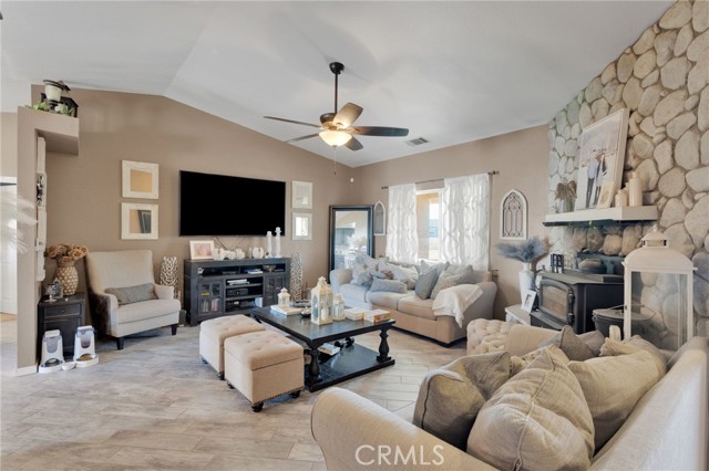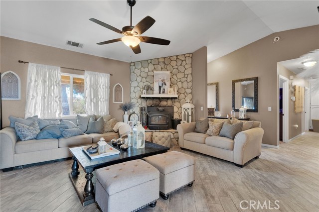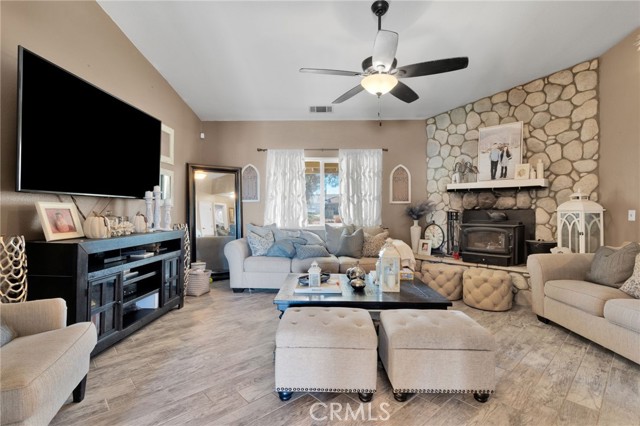 !!!!PAID SOLAR!!!! Rare High-Desert Modern Farmhouse Retreat on 1.14 Acres – Privacy, Upgrades, and Resort-Style Living! Step into a rare High Desert treasure a spacious and private sanctuary set on 1.14 acres border-lining Phelan, Oak Hills, and Victorville. This beautifully designed 4-bedroom, 2-bath home offers approximately 2,148 sq ft of living space and comes with PAID SOLAR, giving you comfort and efficiency. From the moment you arrive, the charm begins: a gentle desert breeze greets you on the welcoming front porch. Inside, the open living area is anchored by a cozy wood-burning stove. New tile flooring throughout enhances the clean, cohesive modern-farmhouse feel. The kitchen is a true centerpiece, offering stainless steel appliances, a movable center island with wood countertop, double oven, cooktop, dishwasher, microwave, and abundant cabinetry finished in a stylish distressed look. With views of the expansive backyard, the kitchen seamlessly blends indoor and outdoor living ideal for entertaining or everyday comfort. The primary bedroom has been thoughtfully expanded into a truly luxurious suite, featuring 2 walk-in closets, a fireplace, and a beautifully upgraded ensuite complete with double sinks, a vanity area, and a walk-in shower. The additional three bedrooms are generously sized, and the second bathroom features a spacious layout with a shower/tub combo and tile countertops. The laundry room is conveniently tucked away in its own dedicated closet. Step outside and embrace resort-style living: a sparkling in-ground pool with rock slide, spa with a grotto waterfall, and an expansive patio area ready for gatherings, barbecues, or quiet relaxation. For hobbyists, car lovers, or RV owners, the property includes a massive 30' x 40' detached RV garage/workshop with a 14-ft high door, 50 amp plug for RV or compressor/welder, and a 100 amp service panel. The home is also equipped with a generator switch, offering peace of mind and backup power when needed. A 12 x 20 shed. The entire property is fully fenced with plenty of space for kids, pets, toys, or future additions. Located near Baldy Mesa Rd in the highly desirable Snowline School District and offering quick access to Phelan Rd and the freeway, this home delivers the perfect blend of privacy, space, style, and convenience. Enjoy wide-open skies, unforgettable desert sunsets, and the freedom to stretch out in a place that feels like your own private retreat.