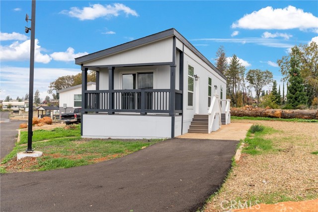 Welcome to Unit 1, a beautifully updated 2-bedroom, 2-bathroom home offering 754 sq. ft. of comfort and style in one of Paradise’s most conveniently located manufactured home communities. Step inside to an open and inviting floor plan with laminate wood flooring that flows seamlessly throughout the living spaces. The designer kitchen features modern cabinetry that contrasts beautifully with the countertops, stainless steel appliances, and a layout that makes cooking and entertaining easy. Just off the living room, a sliding glass door leads to your private patio—perfect for morning coffee, evening unwinding, or a quiet outdoor meal. Down the hall, the convenient laundry area sits just outside the guest bathroom, making everyday living a breeze. At the end of the hallway, the primary bedroom offers its own retreat with an ensuite bathroom and a spacious walk-in closet tucked just beyond the vanity area. Located in a family-friendly park, you’ll enjoy two months of free rent, high-speed internet included with your space rent, a fully fenced dog park with a cleanup station, a horseshoe pit, and a covered picnic/BBQ area ideal for community gatherings. Set on centrally located Sawmill Road, you’re just minutes to Paradise schools, local amenities, and an easy commute down the Skyway to Chico. Unit 1 is the perfect blend of comfort, functionality, and community.
