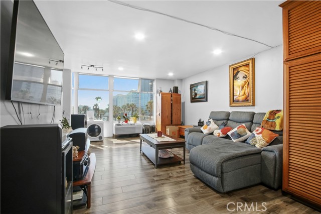 Welcome to urban coastal living in the heart of downtown Long Beach. This light-filled 2 bedroom, 1 bath condo offers an open living space framed by city skyline views and a delightful peek-a-boo water view. The living room flows to a dining area perfect for entertaining, while the kitchen features an efficient layout, all with wonderful views.. Both bedrooms are comfortably sized; the primary enjoys natural light and easy access to the bathroom. Hardwood/laminate flooring runs throughout the main areas, convenient building laundry, You can add laundry to your unit. Steps from restaurants, shops, nightlife, and transit — ideal for commuters or anyone who wants a true downtown lifestyle with occasional coastal breezes. Low-maintenance condo living with community amenities (secure entry) and just minutes to the waterfront and Shoreline Village. THE SELLER IS OFFERING 1% BACK OF THE PURCHASE PRICE TOWARDS BUYERS' CLOSING COSTS.