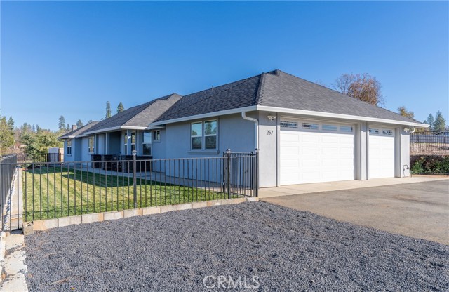 Stunning 3 bedroom, 3 bathroom custom-built home with over ¾ of an acre of land, in one of Paradise’s most sought-after westside neighborhoods! The house is on a .41-acre lot at 257 Tranquil Drive on the corner of Redbud and Tranquil. The 2nd adjoining lot is a .36-acre lot at 262 Rose Lane on the corner of Redbud and Rose, and has a current and active account with Paradise Irrigation District (PID). Built in 2020 by local builder Anderson Brothers Corp, this home is stylish, warm and welcoming, with an open floor plan, vaulted ceilings, and a cozy fireplace in the living room. The gourmet kitchen is designed for those who love to cook and entertain. It features custom tile backsplash, KitchenAid stainless-steel appliances, granite countertops, a large walk-in pantry, and double ovens. The open floor plan also features a separate dining room area. From the living room, you can step outside onto your private back patio, a perfect outdoor space that creates an inviting atmosphere for relaxation or entertainment, and it is landscaped with flowering perennials and mandarin, tangelo, and grapefruit trees. All three citrus trees produce fruit. There is also a front porch with a commanding view of the neighborhood and beautiful skylines. This property offers the ideal blend of privacy, views, and accessibility. The primary bedroom is spacious and has a private view of the backyard. It features a walk-in closet and an en suite bathroom with custom tile and a jetted tub. The other bedrooms are good-sized, with carpeting and walk-in closets. The bathrooms all have custom tile. Laminate flooring is throughout most of the house for easy maintenance. There is a bonus room that can be used as an office or den. This home also features HVAC, an on-demand water heater, and a whole-house water filtration system, a three-car garage, offering ample space for vehicles and storage, and low-maintenance mature landscaping with an automated drip system set on timers. Concrete patios, sidewalks and gravel surround the home. There is also plenty of off-street parking for you & guests. This property has a ton of potential for gardening, and plenty of room for all your toys. The yard is fully fenced with a sturdy, low maintenance metal fence, as is a second side yard area on the west side. This home is a perfect blend of design, comfort, and functionality. Schedule your personal tour and don’t miss the opportunity to make this exceptional property your home!