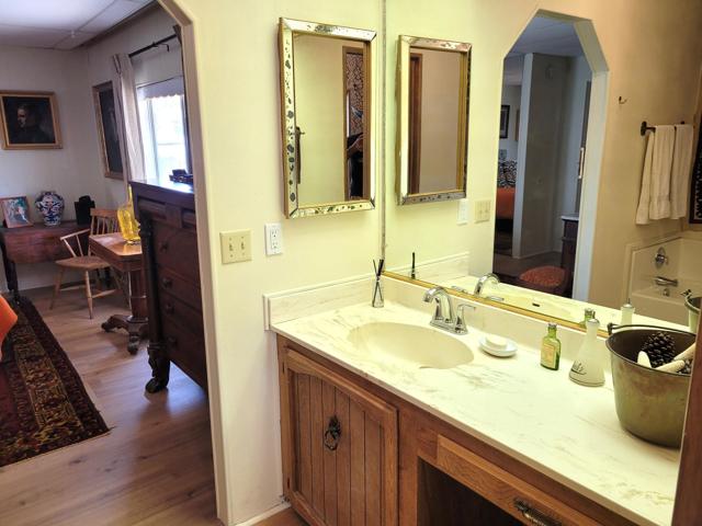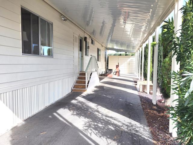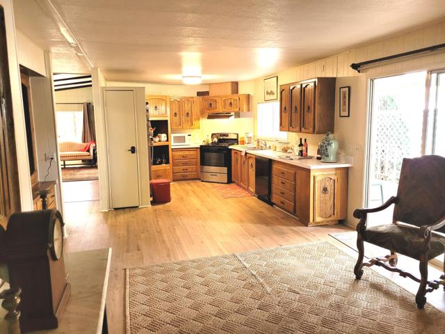 This 1977 triple-wide mobile home by Lancer, with 1590 square feet, has been beautifully updated and modernized. Improvements made in Fall 2024 include new laminate flooring throughout, a new HVAC system, a new roof, new stainless steel appliances in the kitchen as well as new countertops and sink, and fresh paint throughout, both exterior and interior. Entry to the home, through the newly carpeted west-facing deck with mountain views, leads into large and bright living room and adjacent dining area. A short hallway leads to the kitchen and spacious family room with sliders out to the deck. Opposite is the laundry room with full-size W / D and utility sink. The guest bath is accessed via the laundry and the adjacent guest bedroom has a reach-in closet with useful built-in storage. The primary bedroom, at the rear of the home, is spacious and light, also has a reach-in closet with built-in storage; the ensuite primary bath has a lovely vanity and garden tub with a door to the separate commode and shower stall. Access to the large additional room on the west side of the home is through a door at the end of the front deck; this room, currently used as storage, has a utility sink and is fully vented for A/C and heat. There is a large outdoor storage shed on the premises, parking is tandem under the carport on the east side of the home. Space rent for the new owner of this gracious residence will be $750 per month; park approval is required to complete any purchase.