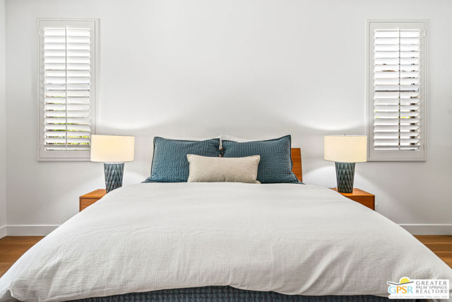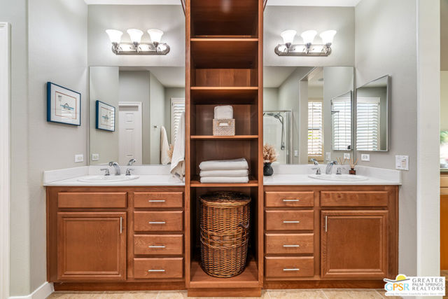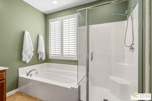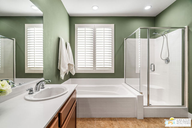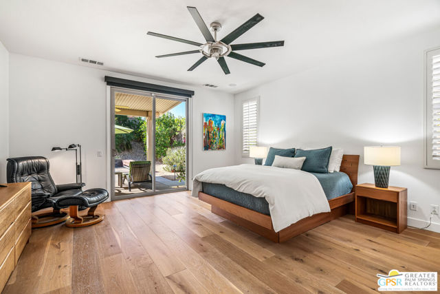 Welcome to a beautifully upgraded and meticulously maintained Palm Desert residence that still shows like a former model home. Offering approximately 2,350 square feet of refined living space on a premium, private southwest-facing lot of approximately 11,326 square feet, this home blends timeless design with modern convenience. The thoughtfully designed floor plan features two spacious primary bedroom suites, each with a private bath and walk-in closet, as well as a third bedroom that has been converted into a dedicated entertainment room with a large-screen TV. Ceiling fans throughout the main living areas and bedrooms provide year-round comfort. The entire interior has been recently repainted in a light, neutral palette, creating a bright and welcoming atmosphere. Real oak wood flooring flows throughout the living areas, kitchen, hallways, and bedrooms, while tile flooring remains in the bathrooms and laundry room. The remodeled kitchen is a standout, showcasing Bosch appliances, including a convection microwave, a refrigerator with filtered water and ice maker, premium countertops with a waterfall edge, an upgraded island, and a reverse osmosis instant hot/cold water system. The laundry room has also been upgraded with new cabinetry, quartz countertops, sink, and washer and dryer. The private backyard has been completely redesigned for relaxed desert living and entertaining, featuring a lap pool with an automatic electronic cover, a covered awning with ceiling fans, stone and paver hardscaping, new landscaping with night lighting, and a stone wall along the west side of the pool. Additional highlights include an owned solar system that significantly reduces energy costs, a Tesla electric car charger in the garage, which is climate-controlled and equipped with a high-efficiency heat pump; a comprehensive Ring security system; plantation shutters on most windows; and new interior and exterior shades for the west-facing windows.