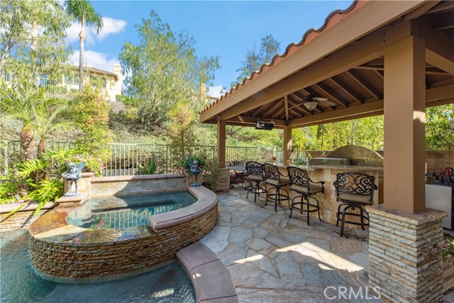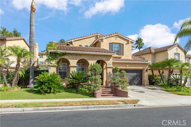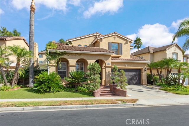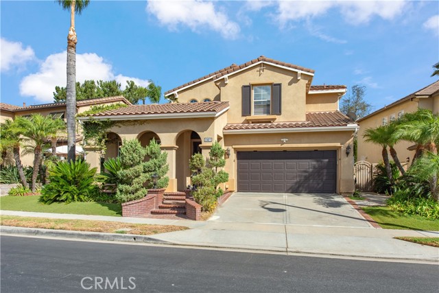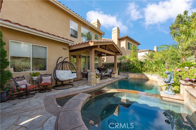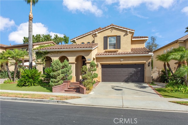 Discover Mediterranean Elegance with a Modern Resort Feel! Step into this stunning Mediterranean-inspired residence that blends timeless design with everyday comfort. A dramatic two-story entryway welcomes you into sun-filled spaces surrounded by graceful architectural detail, stone flooring, tall baseboards, crown molding, soft neutral walls, plantation shutters, and a sweeping wrought-iron staircase that becomes the home’s striking centerpiece. The formal living and dining rooms open through French doors to a tranquil courtyard with a bubbling fountain, the perfect spot to savor morning coffee or unwind with evening wine. The chef’s kitchen is beautifully appointed with granite countertops and backsplash, stainless-steel appliances including a Thermador multi-burner cooktop, double ovens with convection and steam features, a hammered copper farmhouse sink with reverse osmosis, pull-out shelving, wine fridge, and a generous breakfast bar adjoining a cozy breakfast nook. An inviting family room sits just off the kitchen, offering an open-concept flow ideal for relaxation and entertaining, complete with a marble-faced fireplace and direct access to the resort-style backyard. The first floor also includes a powder bath and a well-designed laundry room with cabinets and sink. Ascend the grand curved staircase to the serene upper level. The spacious primary suite features dual walk-in closets with custom built-ins and a luxurious spa bath with jetted soaking tub, expansive walk-in shower, and dual vanities. Three additional bedrooms provide versatile options for family, guests, office, or fitness space, all served by an upgraded secondary bath finished in stone and granite. Now for the showstopper, the backyard retreat! Enjoy your own private oasis with a sparkling saltwater pool and spa, cascading waterfalls, a covered patio with ceiling fan and heater, and a full outdoor kitchen pavilion with granite bar seating for gatherings of any size. Additional highlights include a 3-car tandem garage, tankless water heater, solar panels, custom entry door with decorative glass and iron, ceiling fans, lush landscaping with turf lawn, and thoughtful upgrades throughout. Conveniently located near top schools, shopping, parks, toll roads, and freeway. This home offers a rare blend of luxury, comfort, and resort living every day. Come experience it for yourself!