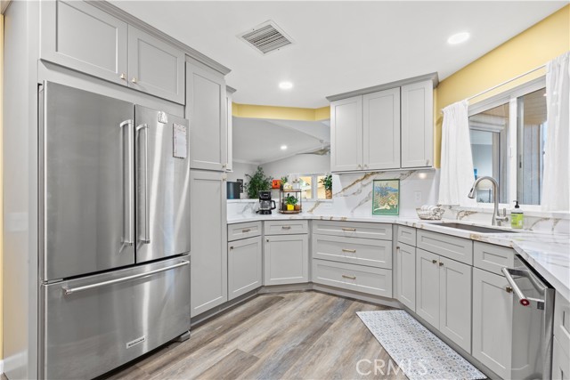 No space rent! At The Groves you have land ownership along with your home; a rare opportunity in one of Irvine’s most desirable active adult neighborhoods. The Groves is a premier 55+ gated community, where comfort, convenience, and lifestyle come together. This updated 2-bedroom, 2-bath home features a garage, private yard, two patios, and an expansive front porch. The beautifully designed kitchen overlooks the living room and showcases gray shaker cabinetry, a gas oven and cooktop, stainless steel microwave and dishwasher, and ample counter space and storage. A separate dining area and breakfast bar make it ideal for both everyday living and entertaining. Luxury vinyl plank flooring flows throughout the home, complemented by modern enhancements such as recessed lighting, ceiling fans, and drywalled walls and ceilings in most areas. The bathrooms have been tastefully refreshed, with dual sinks in the primary suite. Step out onto the inviting front porch to enjoy morning coffee or evening relaxation while taking in peaceful park views. The Groves Lifestyle Living at The Groves is about more than just a home, it’s about community. Residents enjoy an impressive array of amenities, including a recently renovated year-round heated pool and spa, gym and sauna, pickleball, tennis, basketball, lawn bowling, and a putting green. The expansive clubhouse offers banquet facilities, lounges, and game rooms, along with creative spaces such as a ceramics studio and woodshop. Additional highlights include a community garden, BBQ areas, on-site hair salon, RV parking, car wash area, and a 24/7 attended gate. With a full-time management team and dedicated activities coordinator, the social calendar is always full of clubs, events, and outings. This is your chance to own in the “Bubble within the Bubble”! An oasis where neighbors truly become friends. Schedule your private showing of Space 505 today and discover the lifestyle that awaits at The Groves.
