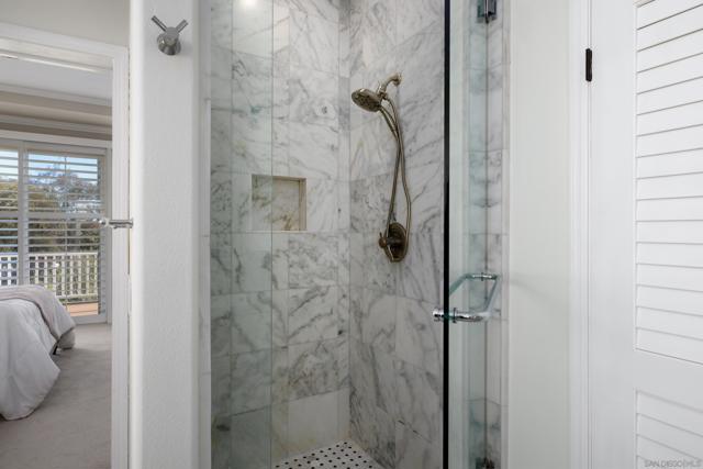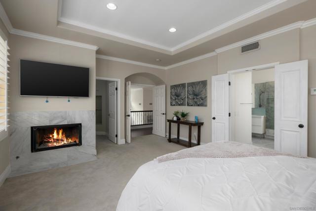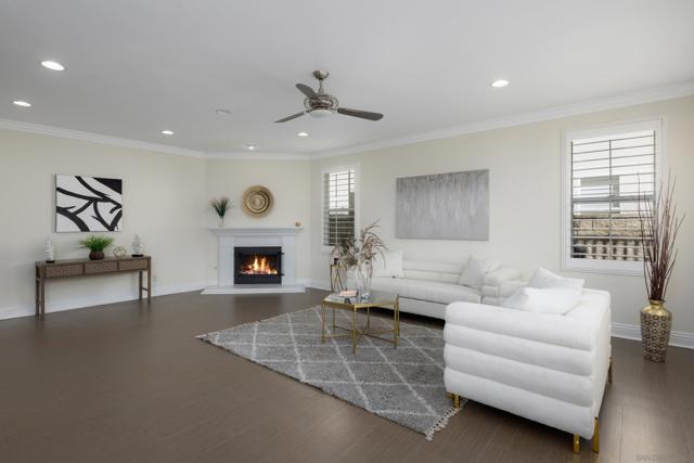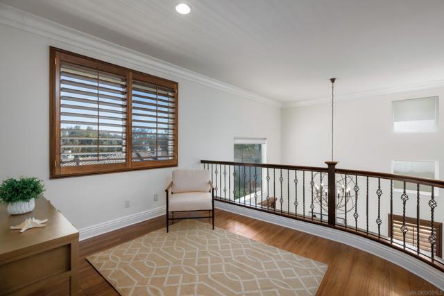 Located within La Jolla’s prestigious gated Ridgegate community and the highly sought-after La Jolla school district, this exceptional residence presents one of the neighborhood’s most desirable and rarely available floor plans. Soaring 20 foot ceilings, Italian marble floors, a crystal chandelier entry, and a custom wrought iron staircase create a striking first impression. Crown moulding and plantation shutters add refined detail throughout. The remodeled chef’s kitchen showcases stainless steel appliances and an expansive 10 foot center island, seamlessly opening to generous living and entertaining spaces that include formal living and dining rooms and an oversized family room. The home offers four bedrooms plus a versatile loft and 3.5 baths, featuring hardwood floors and marble appointed bathrooms throughout. The private primary suite is a true retreat, complete with dual walk in closets, a remodeled marble bath, a marble fireplace, and a secluded deck. A ground level bedroom with en suite bath provides ideal accommodations for guests or multigenerational living. Upstairs, two additional bedrooms, a full bath, and a spacious laundry room complete the layout. Upgrades include brand new HVAC systems, a new Rheem water heater, a reverse-osmosis water filtration system, SunTek solar window film, and 22 fully owned Tesla solar panels. The garage features built in storage and EV charging readiness. Ridgegate residents enjoy resort style amenities including a heated pool and spa, clubhouse, sports court, BBQ area, playground, and private park, all with the lowest HOA fees in La Jolla.