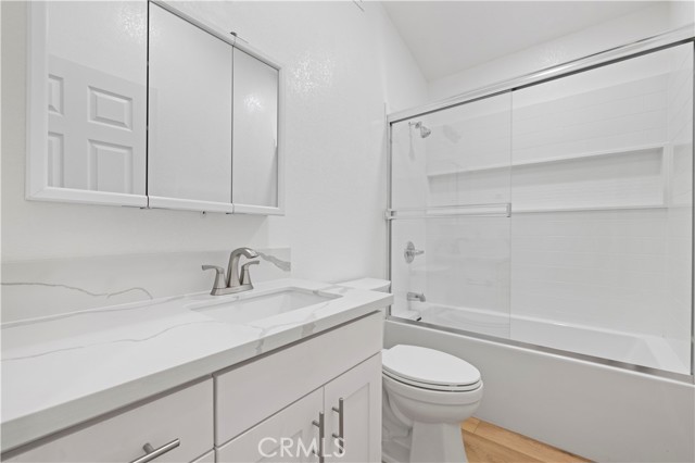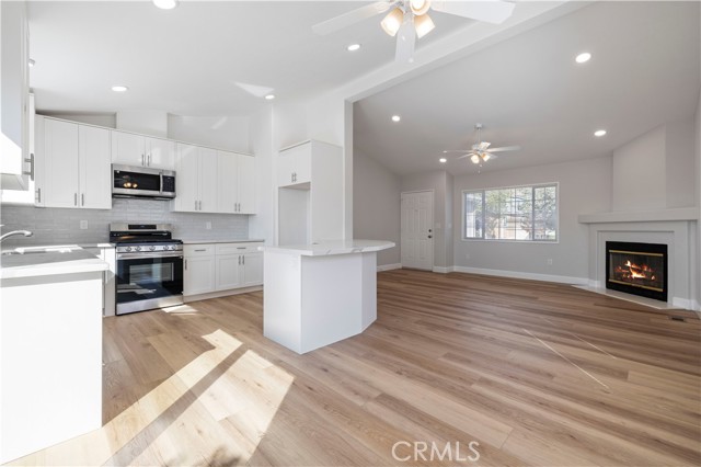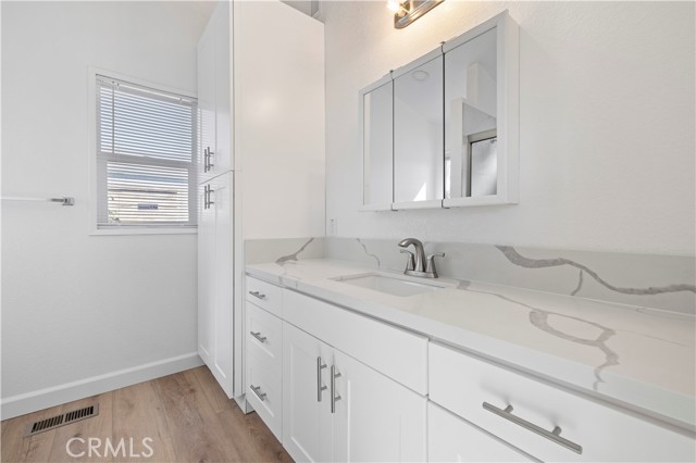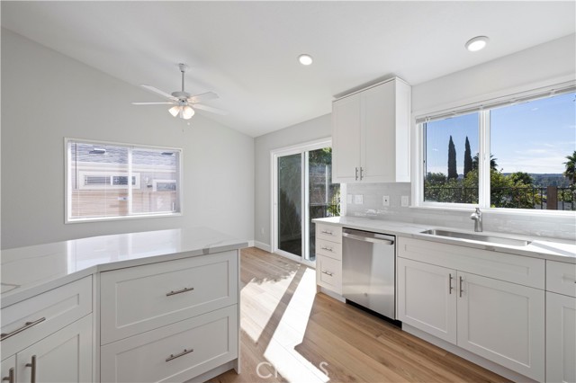Beautifully upgraded 2 bedroom, 2 bath home showcasing modern finishes and a bright, open layout. The remodeled kitchen features white soft-closing cabinets and drawers, quartz countertops, and stainless steel appliances. Vinyl flooring flows throughout the home, complementing the fresh, contemporary feel. Both bathrooms have been tastefully updated with new vanities, quartz countertops, and stylish fixtures, while the primary suite offers a custom tiled walk-in shower. Additional upgrades include dual-paned windows and slider, recessed lighting, and more.