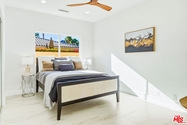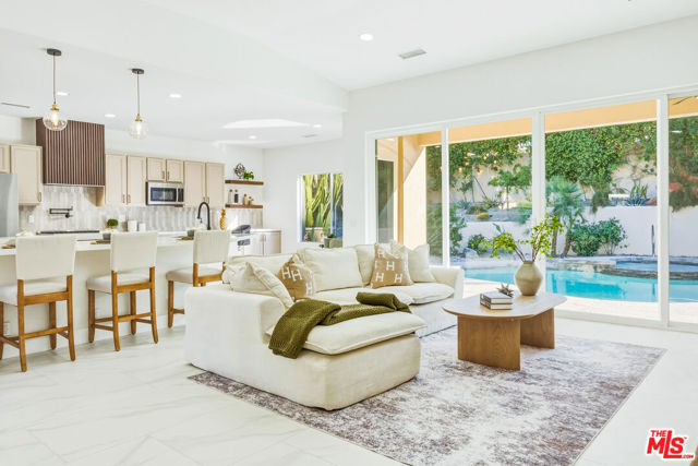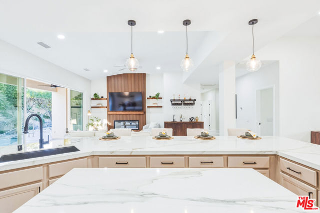 Discover a rare and compelling offering in the popular 24-hour guard-gated community of Lake La Quinta. This extensively reimagined 4-bedroom, 3 full-bath residence delivers a level of design, finish, and privacy seldom found at this price point. Positioned between the community's lower and upper price tiers, this home offers elevated architectural quality without reaching the highest price echelon, a strategic opportunity in one of La Quinta's most desirable lake enclaves. Completely revitalized under the oversight of a meticulous, experienced real estate investor, all improvements were completed with permits and City of La Quinta supervision. The interior was opened and redesigned for light and flow, finished with large-format 24 x 48 porcelain tile, and enhanced with new doors, appliances, hardware, lighting, and refined detailing throughout. A sculptural electric fireplace wrapped in floor-to-ceiling acoustic wood paneling anchors the living space, complemented by a 75-inch display on a 180-degree mount and a custom 14-foot sliding glass wall that seamlessly connects indoors to the resort-style exterior. The living room's one-of-a-kind Asian-inspired wooden wet bar and expansive open-concept layout create a true centerpiece for entertaining. The expanded chef's kitchen is both architectural and functional, featuring a generous breakfast bar, porcelain countertops, custom cabinetry, roll-out storage, wine cubbies, a beverage cooler, a statement island, a professional 36-inch gas range with pot filler, matte black fixtures, and curated lighting. All bathrooms are fully remodeled with curbless showers, spa-inspired finishes, and updated design, including a reconfigured primary suite with a private wet room, soaking tub, rain shower, and ADA-conscious layout. A former office has been converted into a true fourth bedroom. Outdoors, the revitalized pool and spa with a flowing water feature create a private retreat, complemented by refreshed hardscape, upgraded landscaping, and a custom built-in gas grill with granite counter and storage designed for effortless entertaining. Lake La Quinta offers a 25-acre private lake with electric boating, kayaking, fishing, tennis courts, pool, park space, boat docks, and a shared boat club, ideally located on Adams Street between Highway 111 and Avenue 48. To fully appreciate the design, quality, and scope of this residence, experience it in person or review it alongside the extensive improvement list. We can't wait to impress you!