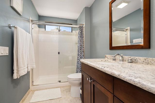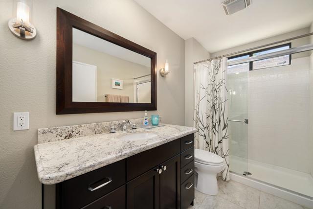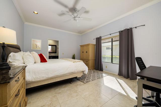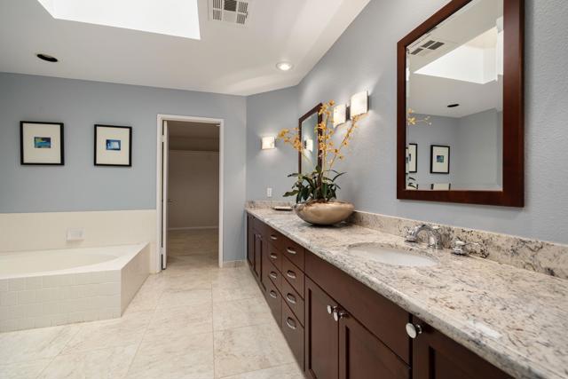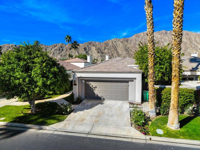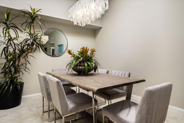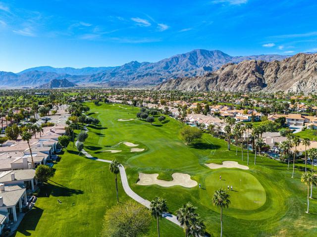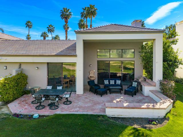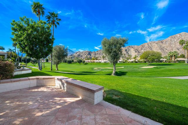 This beautifully remodeled condo is in immaculate condition and offered furnished for a seamless move-in experience. Soft neutral tones and stunning porcelain flooring throughout create a warm, inviting ambiance from the moment you enter.The spacious living room features vaulted ceilings, a cozy fireplace, and a built-in bar--perfect for entertaining. Expansive glass sliders open to a generous double patio complete with a built in BBQ and breathtaking fairway and mountain views, on the famous hole 2 of Arnold Palmer golf course, ideal for indoor-outdoor living.The updated kitchen showcases granite countertops, and a convenient breakfast bar. It flows effortlessly into a comfortable den that also opens to the patio, creating multiple spaces to relax and gather. The dining room is bright and airy with vaulted ceilings and skylights that fill the space with natural light.This thoughtfully designed floor plan includes a separate powder room and three spacious bedrooms, each with its own private bathroom. The primary suite offers its own charming patio, a large walk-in closet.Lush grounds with numerous fruit trees enhance the setting, while the community pool is conveniently located just across the street. The front gate is within walking distance to shopping, dining, and recreation.This exceptional property shows true pride of ownership and is ready for its next chapter.