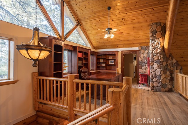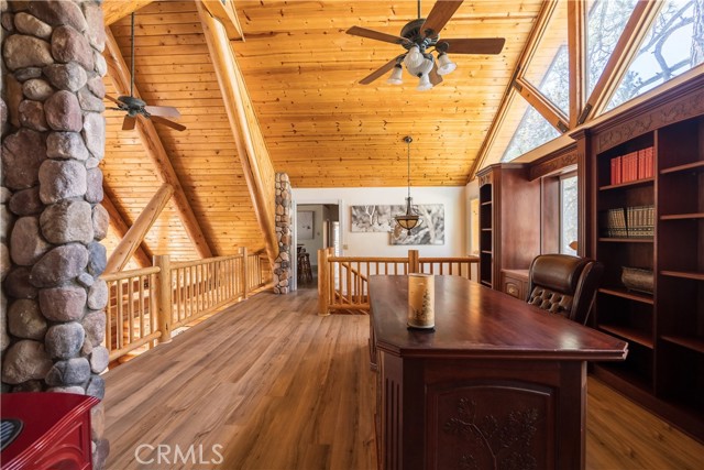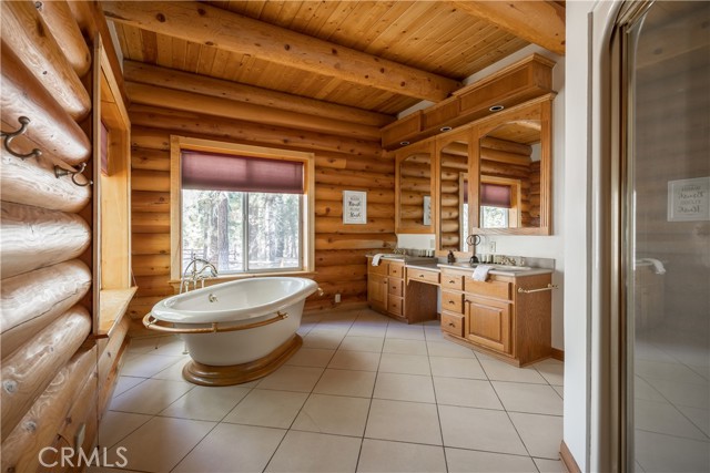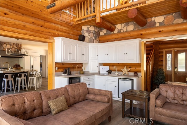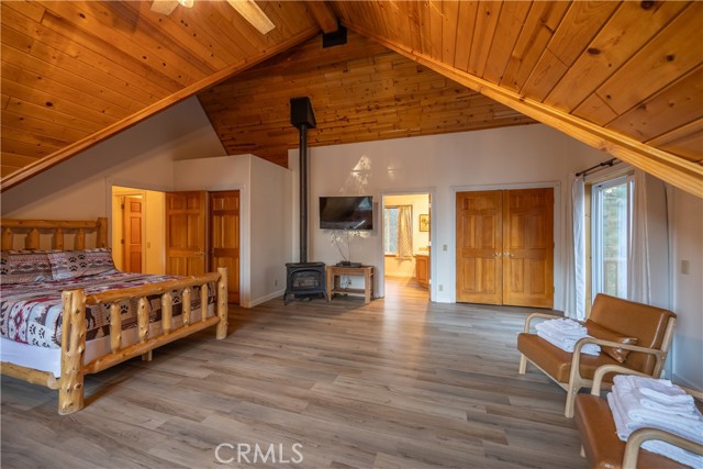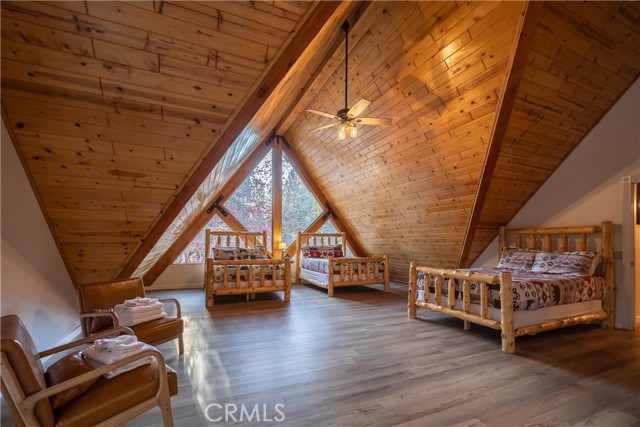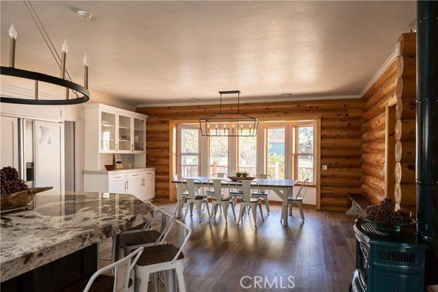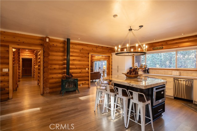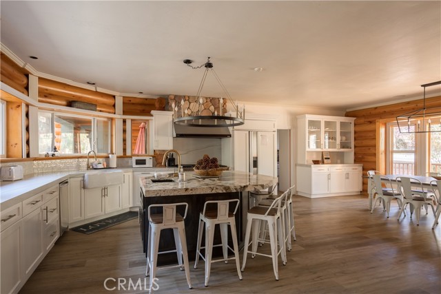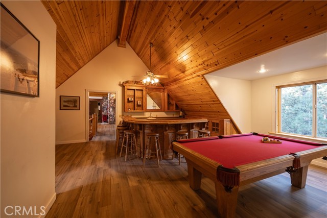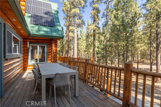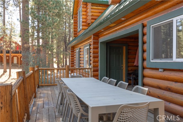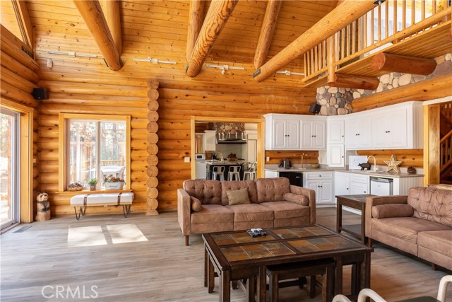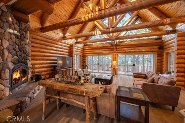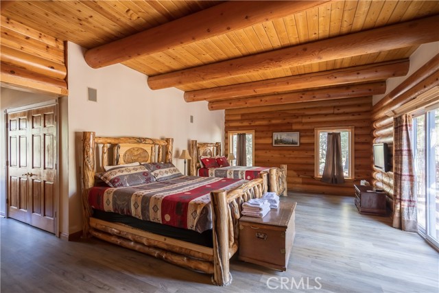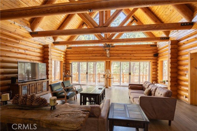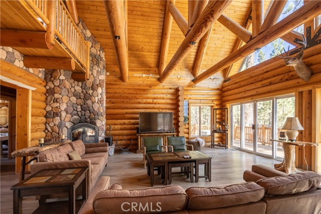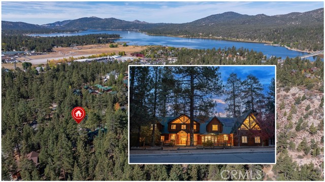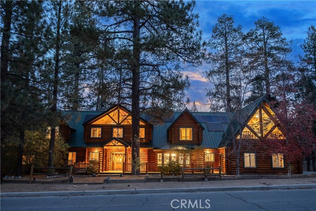 Absolutely amazing log home on a rare level acre + lot in the heart of Big Bear! Ideally positioned on the property to take in the forest setting from the back deck. Amazing interior offers soaring beamed ceilings with 2 story river rock fireplace, 3 huge bedrooms with a bonus 4th bedroom, game room with bar, large master bath for just a few of the highlights. New flooring and recently updated kitchen. Spacious outdoor decking w/ Spa that overlooks the forest to take in the setting & ideal for stargazing. This home is perfect for large gatherings or corporate retreats. 1000 sf 3 car garage with bedroom, in-ground well, metal roofing with new solar system and great income figures. Plenty of room on the property for endless possibilities tennis, pickle-ball court, RV garage or just keep it the way it is for your mountain oasis