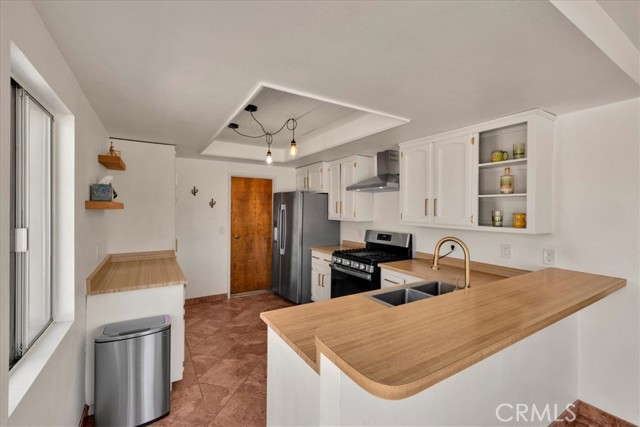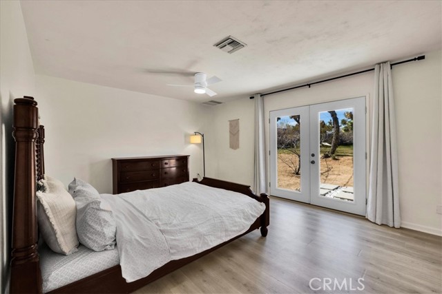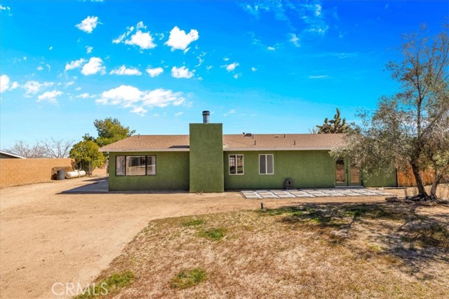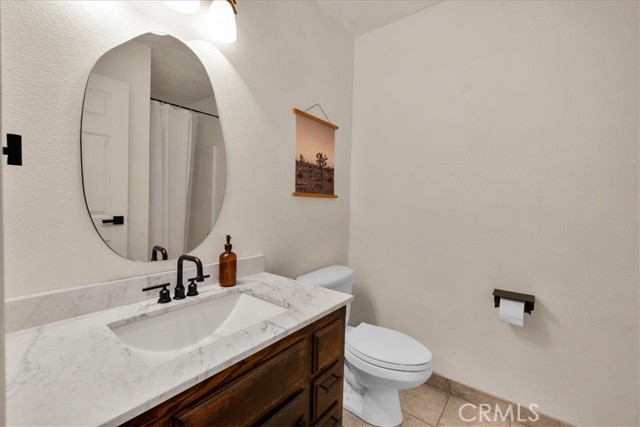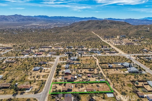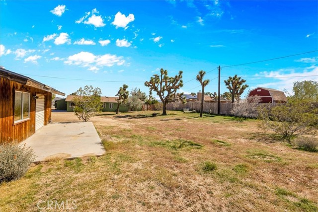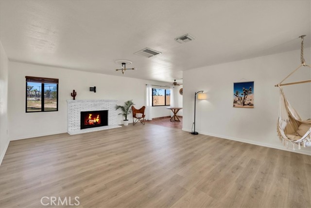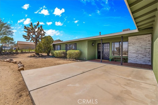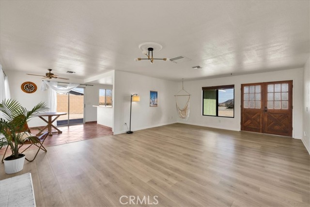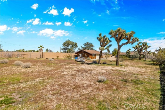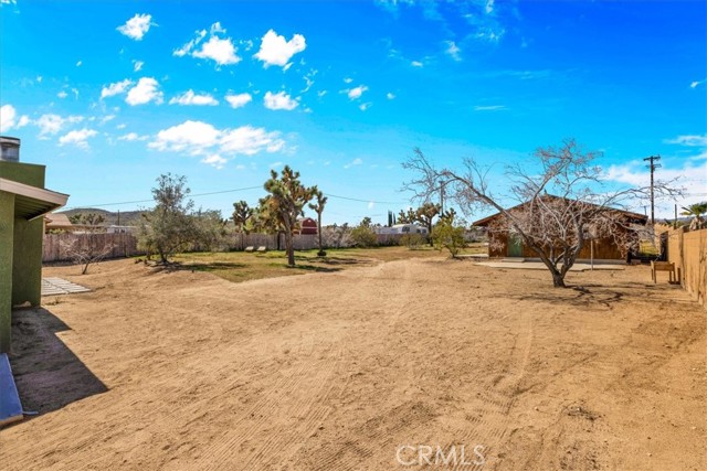 Located in the desirable Mesa area of Yucca Valley, this spacious 3 bedroom, 2 bath home sits on .67 acres and offers modern comfort, open living, and fantastic outdoor potential. An attached 2-car garage provides convenience, while the expansive interior layout creates an inviting place to gather and relax. The massive open concept living space features a classic masonry fireplace, stylish modern light fixtures, and laminate flooring that flows through the main living area, with tile flooring defining the kitchen and dining zone. The dining area includes sliding glass doors leading to the back patio and breakfast bar seating that connects seamlessly to the kitchen. The kitchen itself is well-appointed with stylish countertops, stainless steel appliances including a gas stove, and plenty of workspace. The guest bathroom showcases quartz counters, tile floors, and a walk-in shower. The primary bedroom is generously sized and includes its own sliding glass doors, a large closet, and an attached bath with dual sinks, additional closet, and a tub/shower combo. Both guest bedrooms are spacious and well positioned, and a built-in bench in the hallway adds character and functionality. Outside, the backyard offers a concrete patio, fencing for privacy, and a huge powered workshop—perfect for hobbies, storage, or creative projects. With its blend of modern finishes, open design, and Mesa location, this home captures the best of high desert living.