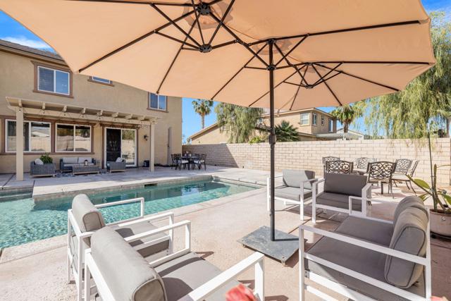Located inside the gated community of Terra Lago, this beautifully maintained 4 bedroom + Office/Den, 3 bath home offers spacious desert living with resort-style outdoor amenities.Set on a large lot, the backyard is designed for entertaining with a PebbleTec pool and spa, tanning shelf, and new pool pump, creating a private retreat ideal for relaxing or hosting guests. The front yard features fresh landscaping with eco friendly artificial turf and newly poured concrete stepping stones for clean, low-maintenance curb appeal.Inside, the open-concept living, dining, and kitchen layout provides seamless flow. The kitchen is equipped with brand-new smart stainless steel appliances, granite countertops, a large center island, and 5 burner cooktop, all opening to the main living area. The interior has been freshly painted, and the home is pre-wired for an alarm system with surround sound throughout.The primary suite overlooks the backyard pool and features a dual-sink vanity, soaking tub, and separate shower. All bedrooms include spacious walk-in closets. A downstairs office/den offers flexible space for a home office, media room, or additional guest accommodations.Additional highlights include a 3 car garage and access to Terra Lago's lake, clubhouse, 24 hour fitness center, and parks. Conveniently located near Acrisure Arena, Fantasy Springs Resort Casino, dining, shopping, hiking, and desert entertainment.Short-term rentals are permitted, offering added flexibility for those seeking income potential.