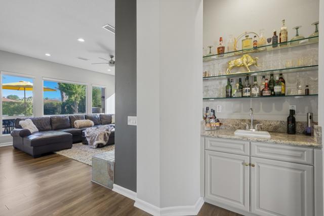 Welcome to your desert retreat in the prestigious guard-gated community of The Citrus Club in La Quinta. This beautifully updated 3-bedroom, 3.5-bath home combines timeless design with modern comfort, offering the perfect balance of indoor and outdoor living. Enter through a private gated courtyard highlighted by a peaceful water feature and views of the Santa Rosa Mountains. Inside, the open and well-planned layout offers both flow and functionality, featuring a spacious great room with a fireplace, a formal dining area, and a wet bar ideal for entertaining. A dedicated office space provides flexibility for remote work or creative pursuits. The chef's kitchen includes abundant cabinetry and seamless connectivity to the living and dining spaces. The primary suite is a true sanctuary with its own fireplace, generous en-suite bath, and direct access to the backyard. Each guest bedroom offers privacy with its own bath, perfect for visiting family and friends. Escape to your private backyard oasis, featuring a sparkling pool surrounded by mature landscaping that creates a serene, resort-like atmosphere. The home has been thoughtfully updated with luxury vinyl plank flooring, offering a fresh, contemporary feel throughout. Located within The Citrus Club, residents enjoy access to world-class golf, tennis, pickleball, fitness, dining, and social events--making it one of the best membership values in the Coachella Valley. Just minutes from Old Town La Quinta, upscale shopping, dining, and hiking trails, this property offers the ideal blend of luxury and lifestyle. Whether you're seeking a seasonal getaway or a full-time desert residence, this home captures the essence of La Quinta living--elegant, private, and perfectly positioned in one of the area's most sought-after country club communities.