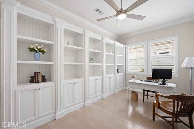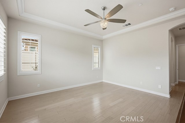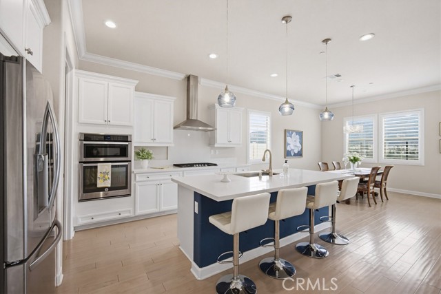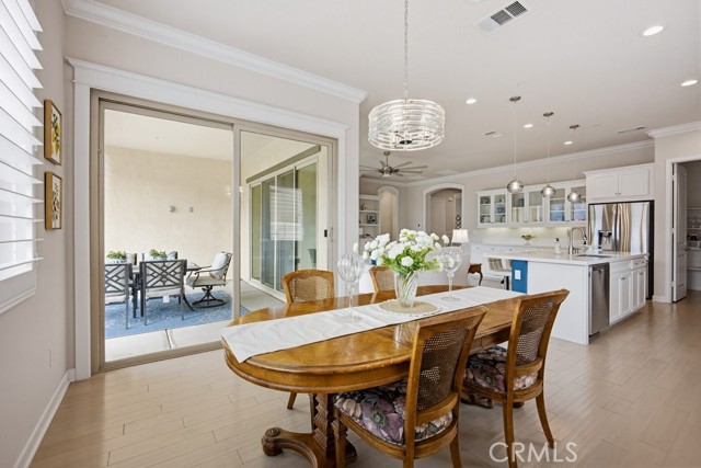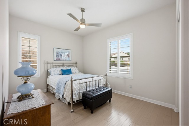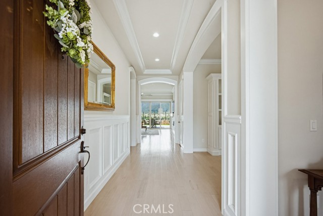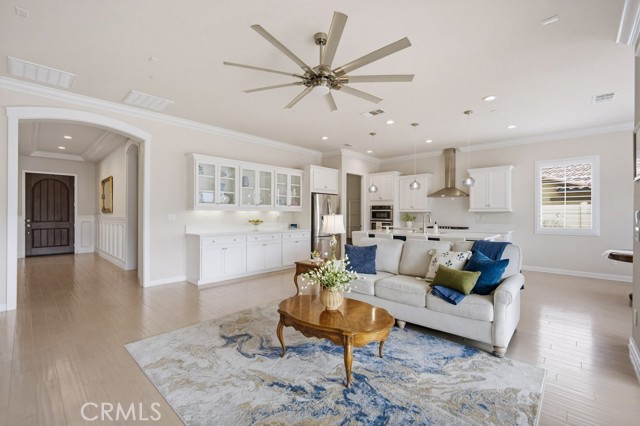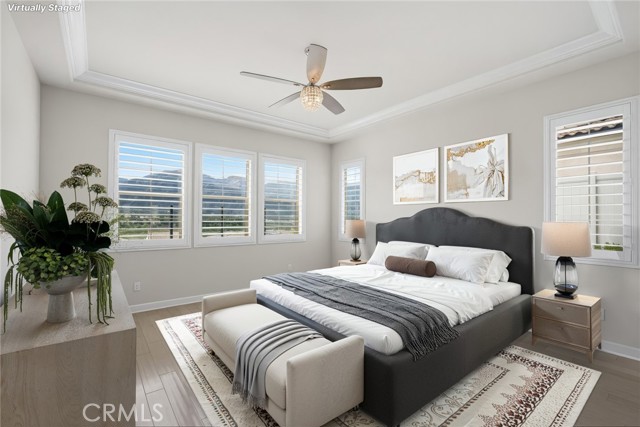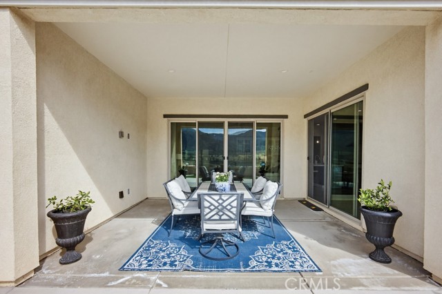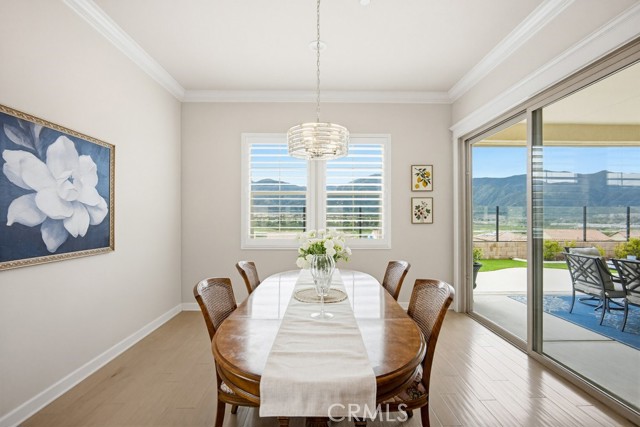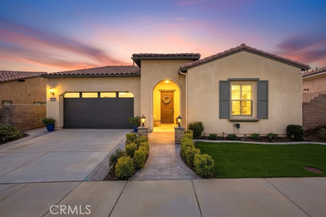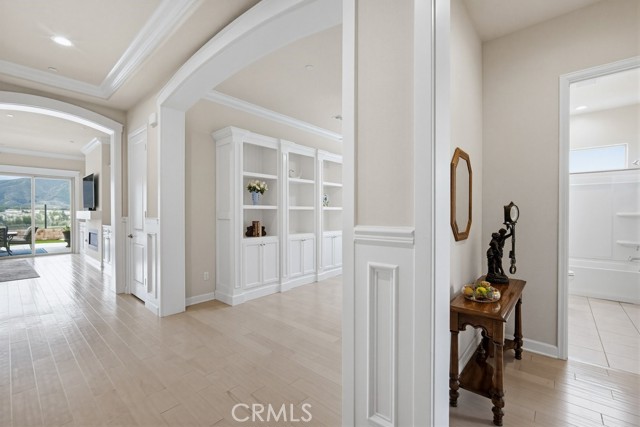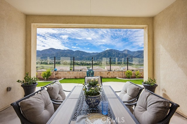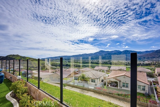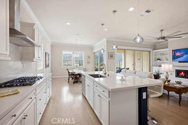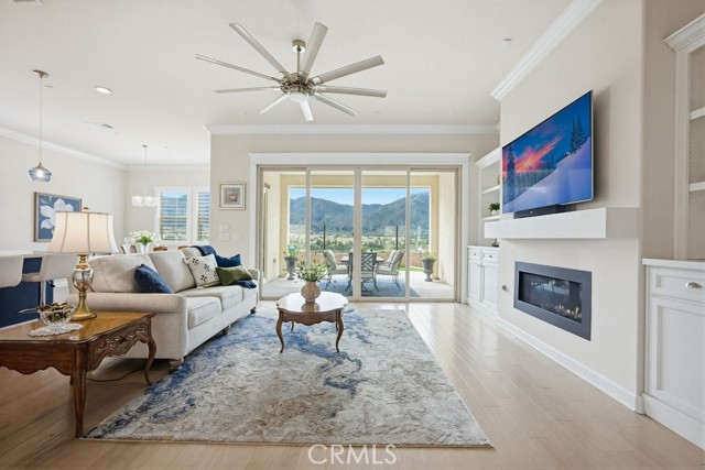 TURNKEY single-story home in the sought-after 55+ guard-gated community of Terramor offering 2,061 sq. ft., 2 bedrooms, 2 bathrooms, and a VERSATILE DEN with custom built-ins. A 42" entry door opens to an elegant interior featuring wainscoting, REAL WOOD FLOORING, and an OPEN-CONCEPT design with dramatic wall-to-wall sliding glass doors leading to the CALIFORNIA ROOM with breathtaking, UNOBSTRUCTED MOUNTAIN VIEWS. The gourmet kitchen boasts QUARTZ COUNTERTOPS, a large island with farmhouse sink, STAINLESS STEEL APPLIANCES including a 5-burner cooktop with hood, WALK-IN PANTRY, designer lighting, spacious dining area, and built-in buffet cabinetry. The living room features a built-in ELECTRIC FIREPLACE, custom shelving, surround sound provisions, and convenient floor outlets. The primary suite offers TRAY CEILINGS, WALK-IN CLOSET, WALK-IN SHOWER with skylight, and upgraded finishes throughout. Additional highlights include a skylit laundry room with cabinetry and utility sink, window shutters, central vacuum system, electric sunshade at the California Room, artificial turf, and installed gas line for future outdoor features. Enjoy RESORT-STYLE amenities including clubhouses, pools, fitness center, pickleball, tennis, bocce ball, dog parks, and an active social calendar. Luxury living with stunning views and thoughtful upgrades throughout.