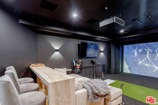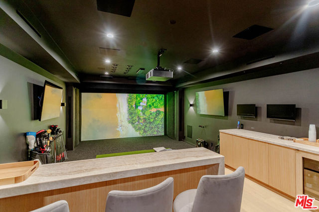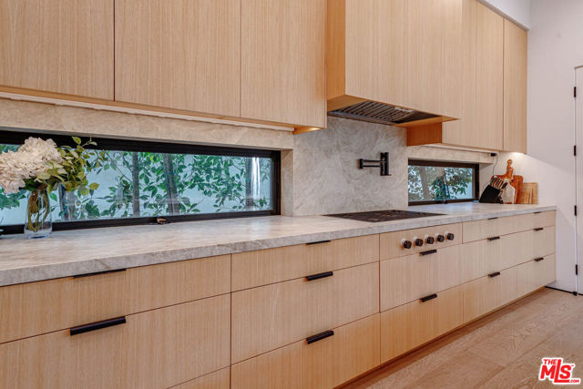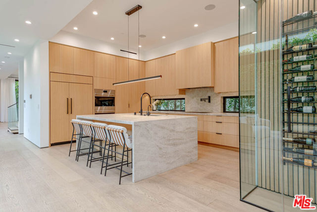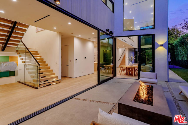 Newer architectural home (built in 2022) in the heart of Brentwood filled with natural light and refined modern design. Ten-foot Fleetwood sliders and expansive windows create seamless indoor-outdoor living to sunny outdoor spaces including a private courtyard with fire pit and mature olive tree, pool/spa, and grassy (turf) yard. South-facing and tucked behind mature ficus for exceptional privacy. Thoughtfully designed with elevated organic materials: white oak floors and cabinetry, leathered quartzite and brushed limestone countertops, clay-textured walls, marble fireplace, and custom cedar siding. Exceptional features include a 1,600 sq ft garage with turntable, elevator, screening room (currently golf simulator), two staircases, two laundry rooms, home automation, wine cellar, and Wolf/Sub-Zero appliances. Primary suite offers its own fireplace, private deck, spa-like bath with dual vanity, soaking tub, steam shower, and walk-in closet. Two additional en-suite bedrooms upstairs, guest bedroom or office with bath on main level, and en-suite guest room on lower level. Incredible Brentwood Location. Moments from Brentwood Country Mart, shops, dining, farmers market, and close proximity to the beach.