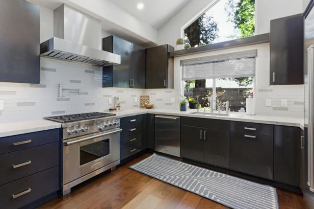Experience elevated living in this beautifully remodeled home featuring high-end finishes throughout. The open-concept layout is enhanced by vaulted ceilings and skylights that flood the living space with natural light. The updated kitchen showcases premium stainless steel appliances, quartzite countertops, a breakfast bar, and an inviting dining area with a built-in bar and cabinetry. The spacious primary suite offers serene views of redwood trees and the surrounding mountain range. It includes a walk-in closet and a custom bathroom with a standalone soaking tub, tile stall shower, and dual vanities. Two additional bedrooms provide comfort and versatility; one features a Murphy bed, the other offers built-in bookshelves above the closet with ladder access. A full bathroom with a custom stall shower serves this wing of the home. Set back from the road, the home also features a private patio with a built-in BBQ grill, outdoor fireplace, and integrated for entertaining or relaxing in peaceful surroundings. Follow the charming walkway to the side yard, where a wine cellar and cozy seating area create an ideal space to enjoy the property's natural beauty. The expansive back deck offers outdoor dining and relaxation. A detached laundry room offers a full sink and generous cabinetry.