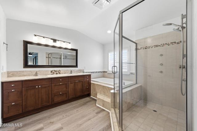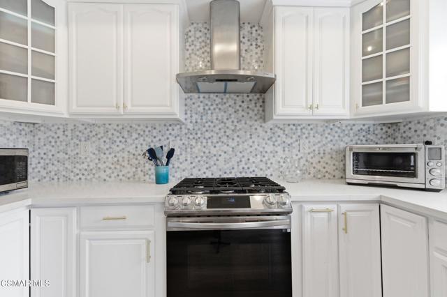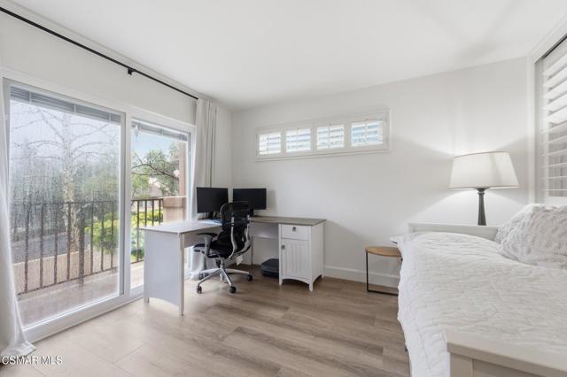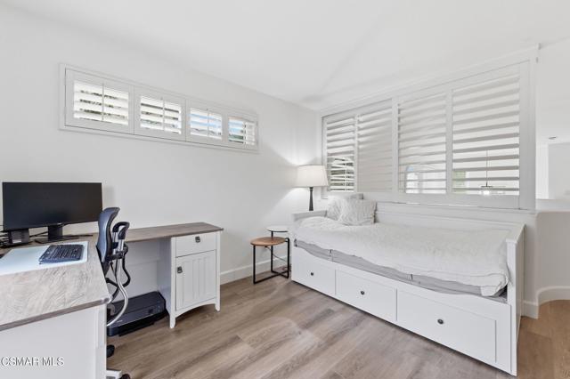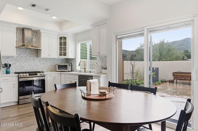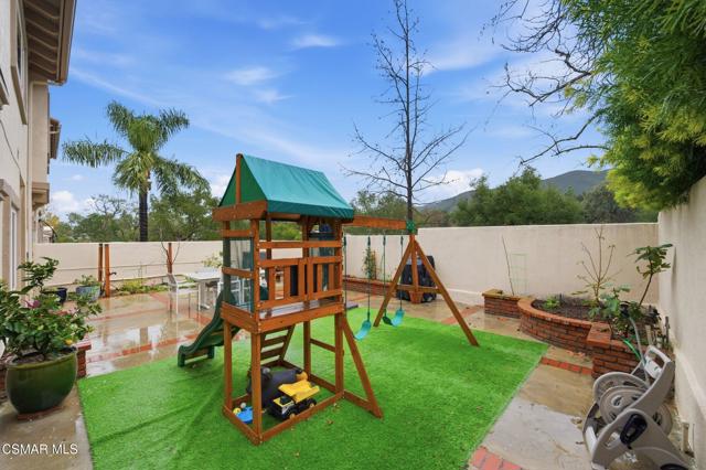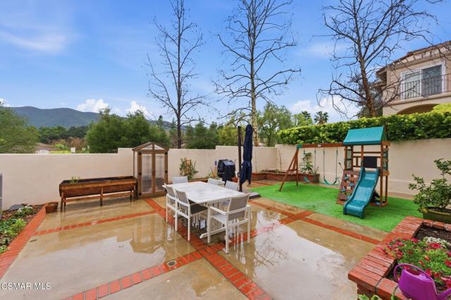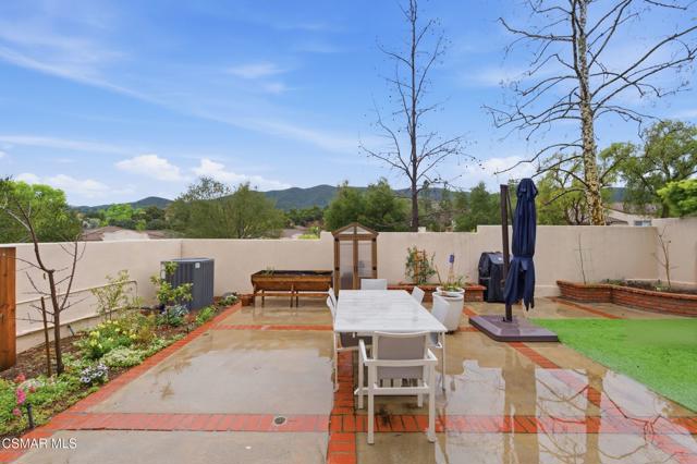 Discover your perfect home in a quiet, serene neighborhood in Newbury Park. This beautiful cul-de-sac residence offers three bedrooms plus an office. Living room with high volume ceilings, beautiful stone gas fireplace. Enjoy modern upgrades including dining in the remodeled kitchen with quartz countertops, stainless steel appliances, laundry room, newer windows, shutters, flooring, and sliding doors, as well as updated HVAC and water heater installed in 2021. Bedrooms located upstairs, Double door entry to the Primary bedroom, private ensuite with dual vanity, oversized walk-in shower and soaking tub. Secondary bedrooms with mirror wardrobe and ceiling fans. Smart home technology such as a Ring doorbell and alarm system, Ecobee thermostat, myQ Bluetooth garage door, and newer appliances provide convenience and security. Take in breathtaking mountain views with no neighbors behind you and relax in a spacious yard featuring an assortment of fruit trees, strawberries, blueberries, and grapes. This home includes most backyard essentials like a greenhouse, planter box, playset, dining set, and a Cantilever umbrella. Direct access to the attached 2 car garage. The HOA gives access to a community pool, maintains greenbelts. Don't miss this exceptional opportunity to make this stunning property your new home