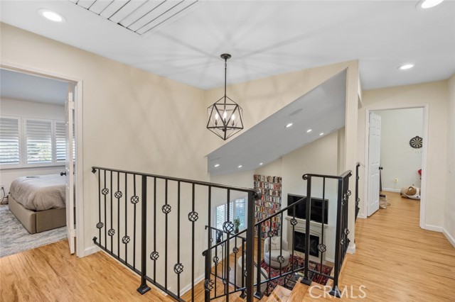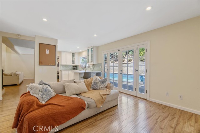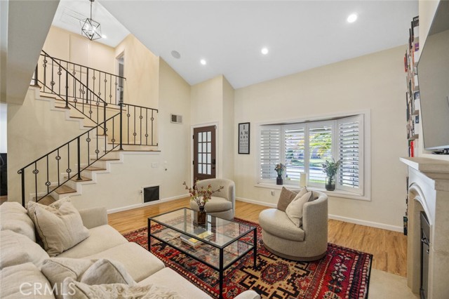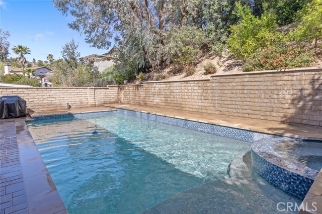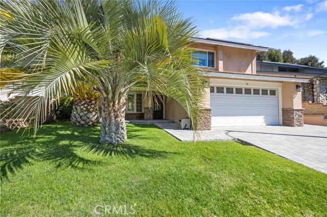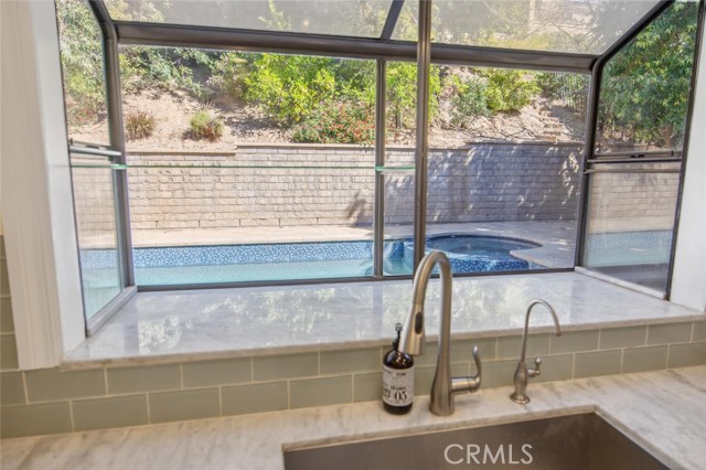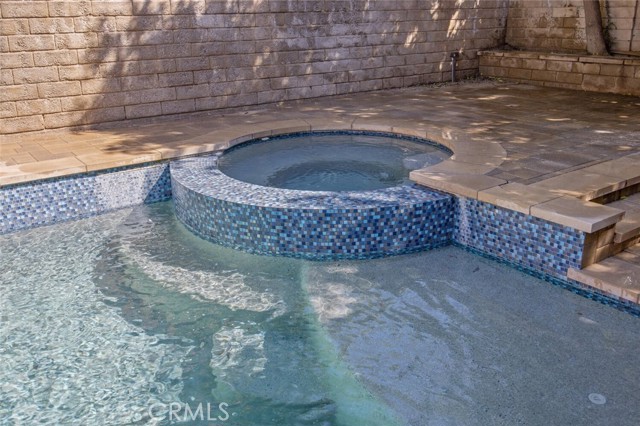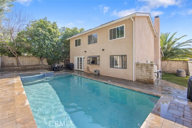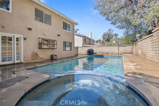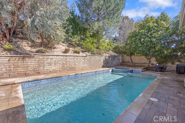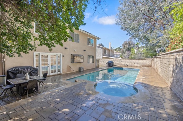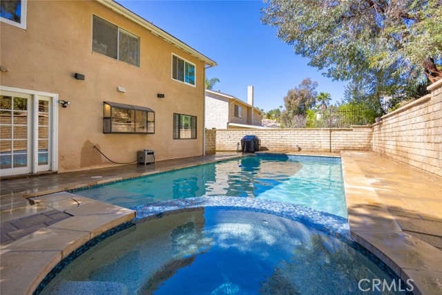 SAUGUS POOL/SPA HOME WITH FOUR BEDROOMS, NO MELLO ROOS, LOW HOA! Excellent curb appeal, gorgeous interlocking paver driveway, walkway backyard patio, and dog run! Mondern rectangular pool with spa with glass tile backsplash/fill line, newer coping! Rich dark front door with privacy glass windows, MANY windows upgraded to white vinyl dual pane throughout home. High ceilings in the living room and custom stone fireplace surround and mantel, modern light fixtures, recessed lighting, wonderfully appointed kitchen with white shaker kitchen cabinets, soft close drawers, marble counters, updated sink and faucet, garden window, stainless steel appliances including refrigerator! HVAC with Nest thermostat, Ring Door Bell included. Family room with French doors leading to a spectacular pool and spa, mature landscape, lots of greenery and trees providing privacy on the terraced hill. Convenient laundry room, and guest bath on first level. All four bedroooms are located upstairs. All bathrooms have been updated with vanities and fixtures over time. Low lease solar enery panels, monthly payment of approximately (currently) *$150. per month with about 10 years left on the lease, agreement under supplements with additional information. Low HOA fee of $95. per month includes a community park, pool, PICKLEBALL and basketball courts. Close proximity to schools, shopping, and parks!