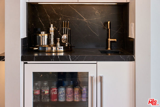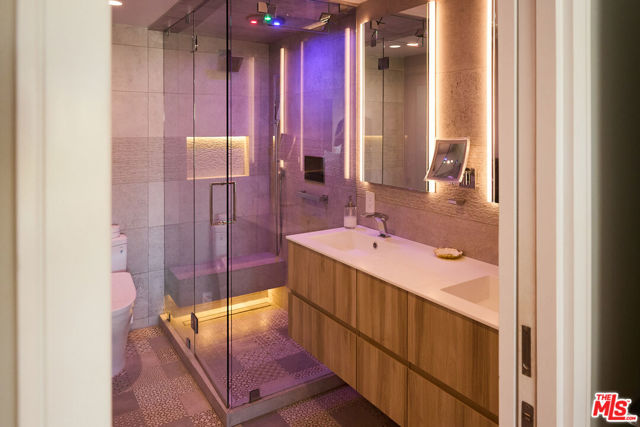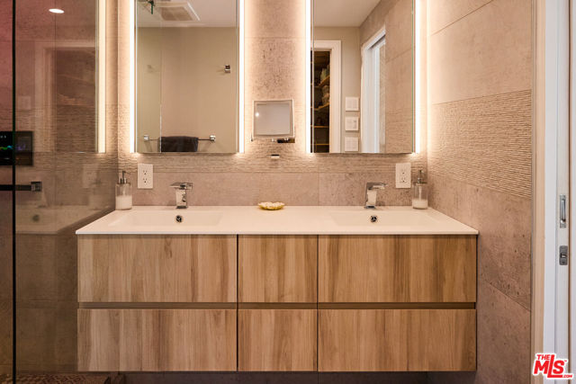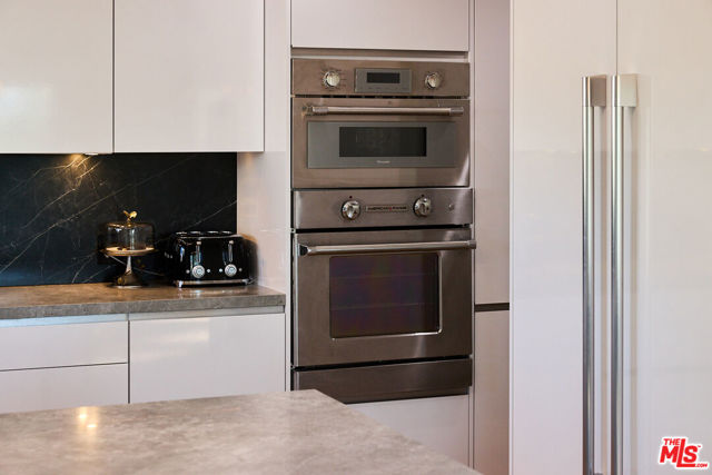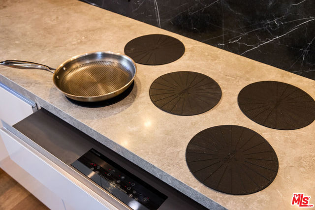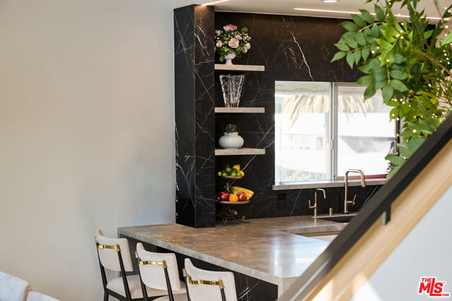 Experience a masterclass in modern luxury at 221 S Gale Dr #403. This meticulously reimagined penthouse underwent a complete down-to-the-studs renovation completed in 2024, creating the only legitimate 3-bedroom, 2.5-bathroom floor plan in the building. Every detail has been thoughtfully upgraded, from the all-new electrical and plumbing systems to the high-efficiency 3.5-ton HVAC with Nest control. The architectural centerpiece is a dramatic living room featuring 18-foot ceilings and a floor-to-ceiling porcelain feature wall with an integrated electric fireplace and a 65-inch TV cutout. The space is complemented by a porcelain wet bar with a wine and beverage fridge, ideal for sophisticated entertaining. The designer kitchen represents the pinnacle of culinary technology, headlined by a state-of-the-art Invisacook invisible induction cooktop set beneath seamless porcelain countertops and custom Porcelanosa cabinetry. Professional-grade features include a premium appliance suite by Signature, American Standard, and Miele, as well as Brizo touch-control fixtures, a dedicated pot filler, and an instant-hot water system with integrated filtration.The primary suite serves as a true sanctuary, boasting dual walk-in closets and a spa-like bath with a steam shower featuring touch-panel controls, integrated music, and mood lighting. High-end finishes continue throughout with Porcelanosa luxury flooring, Lutron app-controlled lighting, and motorized blackout shades. Indoor-outdoor living is seamless with new sliding glass doors leading to a first-floor patio and a private second-floor rooftop deck. Upstairs, a rare 6' x 9' storage room provides exceptional utility. Both first-floor bathrooms include Toto bidets with heated seats. Situated in a secure building offering a heated pool, spa, and tandem parking for two vehicles, this home is moments away from the Beverly Hills tennis courts and La Cienega Park. Experience exceptional style and value just steps from world-class shopping and dining in the heart of Beverly Hills.