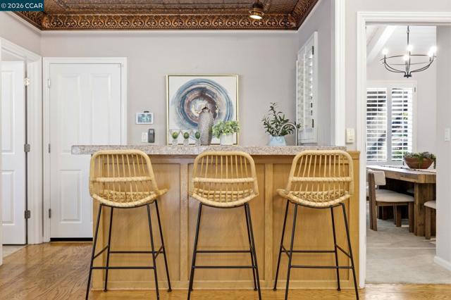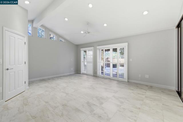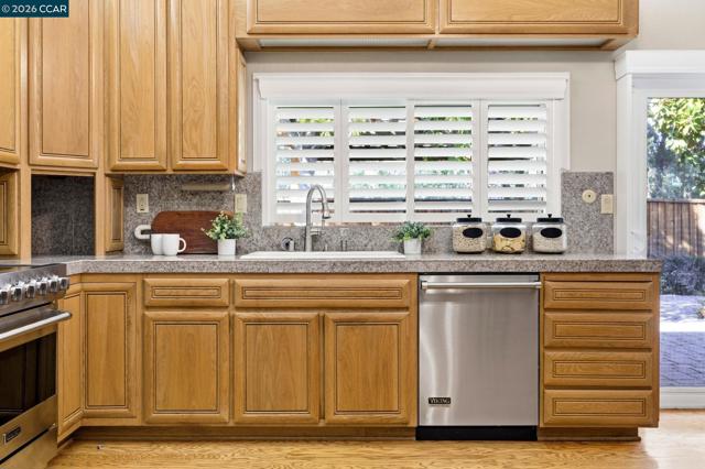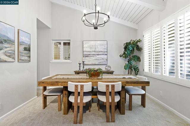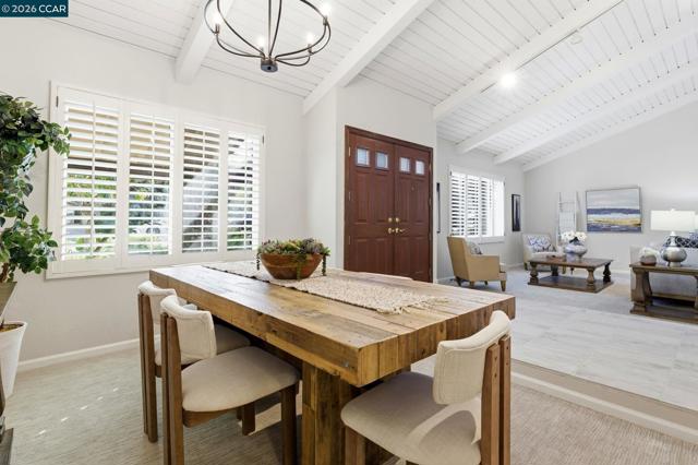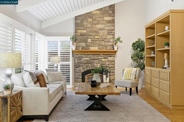 Single-level home tucked at the end of a court featuring dramatic vaulted ceilings & a thoughtfully balanced layout designed for both gathering & everyday living. The main living room showcases soaring beamed ceilings & clerestory windows, while plantation shutters add a polished finish. The dining space is clearly defined, ready for everyday dinners or festive occasions. The kitchen offers extensive cabinetry, granite counters & a full suite of Viking appliances. A window over the sink overlooks the backyard, while the adjoining family room is anchored by a floor-to-ceiling stone fireplace with custom built-ins. A bar enhances entertaining & direct outdoor access extends gatherings to the courtyard. A dedicated laundry room with built-in cabinetry adds convenience. The expansive primary suite offers backyard access, a custom walk-in closet & an ensuite bath with walk-in shower. Two additional bedrooms share a hall bath. Outside, the low-maintenance courtyard-style backyard features expansive paver patios, a pergola for shaded dining, mature magnolia trees & layered landscaping. Ideally located near K–12 schools including Valhalla Elementary just blocks away, Diablo Valley College, Hidden Lakes Park, scenic trails & Downtown Pleasant Hill dining & shopping.
