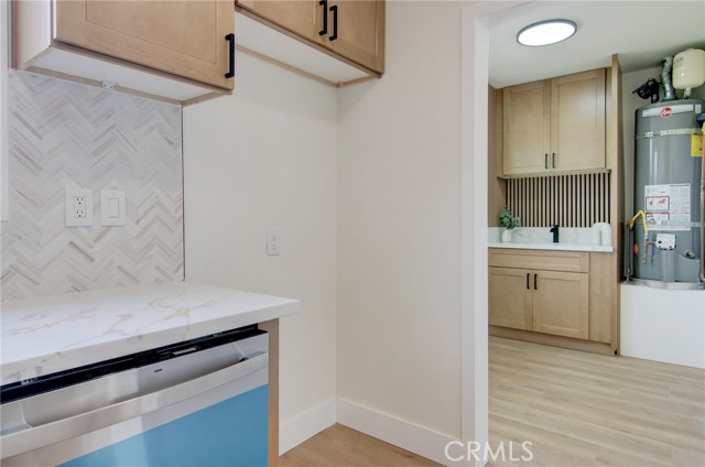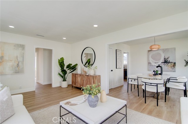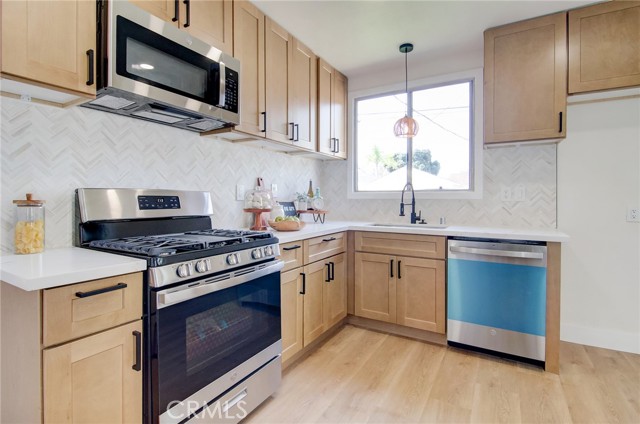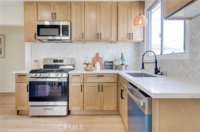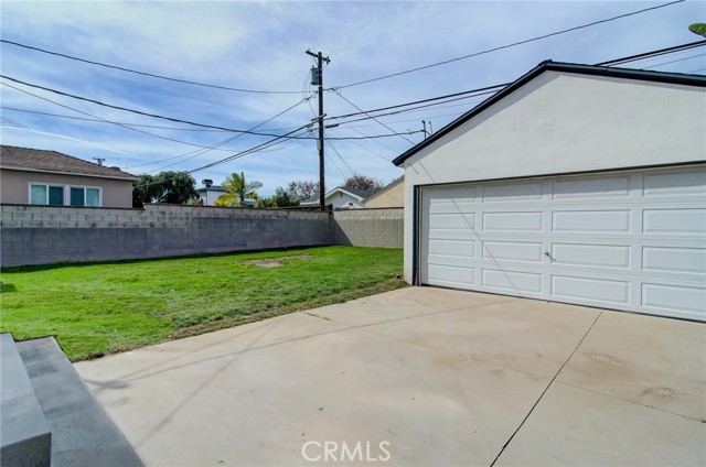 Fantastic purchase opportunity on this beautifully remodeled Lakewood home in move-in condition. New upgrades include: Natural wood shaker solid wood cabinets with black accessories, white/gold quartz countertops and matte marble backsplash, GE appliances (stove, dishwasher, microwave and Moen disposal), large-format porcelain tiles on bathroom floors and shower walls, a 42" bathroom vanity; tempered glass safety shower doors, a humidity-sensing exhaust fan, 6mm, 9" vinyl flooring throughout the house, 5 1/2" floor and window mouldings, 2-1/2" interior door and closet mouldings, accent walls in the laundry room, newly textured ceilings, fresh interior and exterior painting, drywall in interior of the garage, sound damping solid wood decorative accent walls, a dual-pane window and exterior door in the laundry room, closet doors and accessories, section 1 termite work completed, hvac including ductwork for central furnace and AC with Ecobee Smarthome thermostat, GFCI's, switches, outlets, recessed lights, pendant lights, LED bathroom mirror lights, overhead garage door motor with lighting kit and safety sensors, vinyl privacy fence in the driveway, automated sprinkler system with timer, newer roof and PEX plumbing. This home is in an interior location and features a functional floorplan with a spacious living room and dining area, a bright kitchen, nicely sized bedrooms, a separate laundry room, a two-car detached garage and a huge backyard for limitless possibilities. Don't miss out!