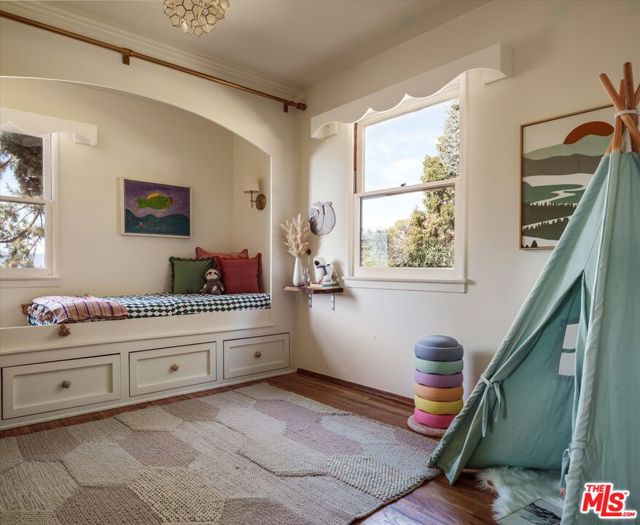 Presenting a preserved yet updated mid-century ranch that exemplifies the spirit of elevated, unpretentious and unspoiled Altadena living. This rare flag lot provides over 20,000 square feet of privacy and tranquility, perched amidst majestic trees and sprawling lawns. With sweeping views to the Pacific, and nestled against the backdrop of the San Gabriels, the single-story four bedroom, three bath home sits squarely mid-lot, harmoniously pulling nature inside through walls of windows, while inviting you outdoors via multiple access points. The sun-drenched dining room opens to a vine-covered pergola, perfect for midday shade and evening meals alike, while a wood-paneled living room with vaulted beamed ceiling and stacked stone fireplace showcase the home's original 1950s rustic character. An updated kitchen accesses a breakfast nook and cozy sunroom, and includes a Bertazzoni stove, tiled countertop and brass hardware on original cabinetry. The large bright and airy primary suite showcases the rear yard via wall-to-wall French doors and boasts an updated en suite bath with lush garden views from a deep freestanding tub, a heated towel rack, dual vanity with brass fixtures and zellige tiled walls. The original bedroom wing features another updated bath and three bedrooms with ample space, light and warmth.The ambling grounds make this property truly exceptional and rare...plus the pond, play house, vegetable garden, and swings provide a priceless backdrop for peace and quiet at home.