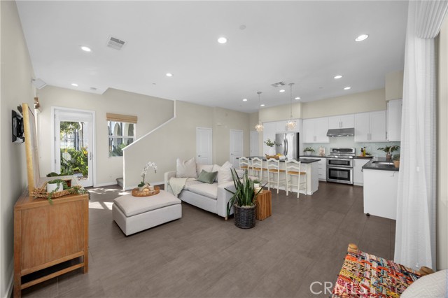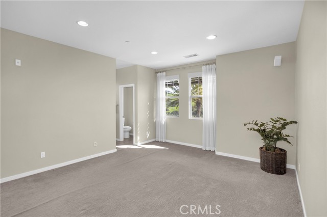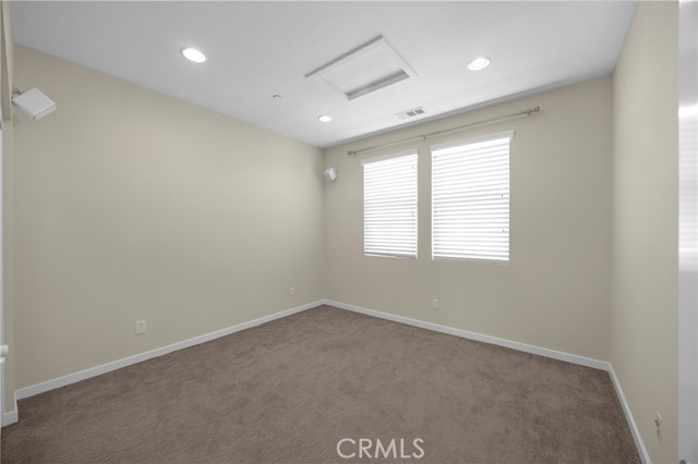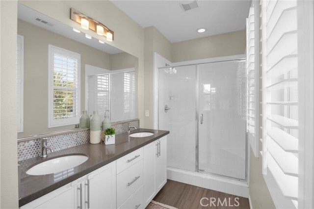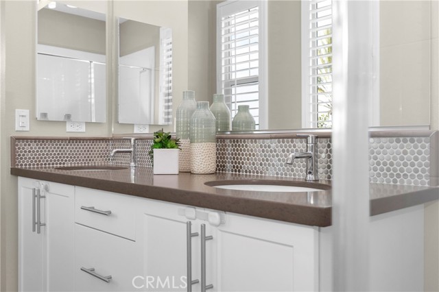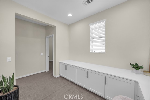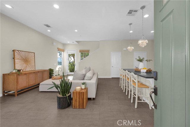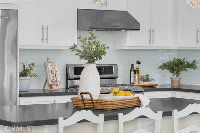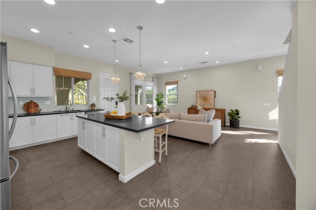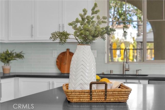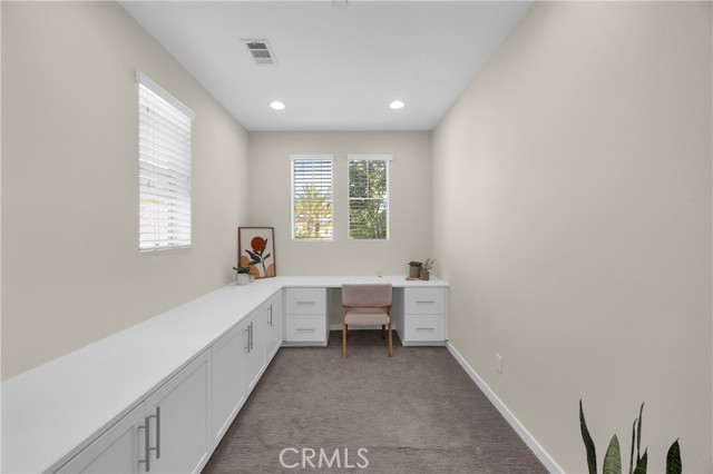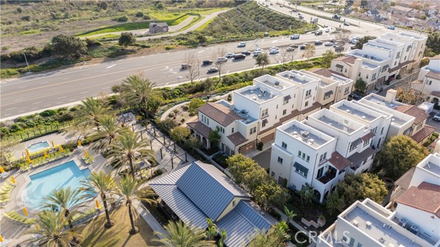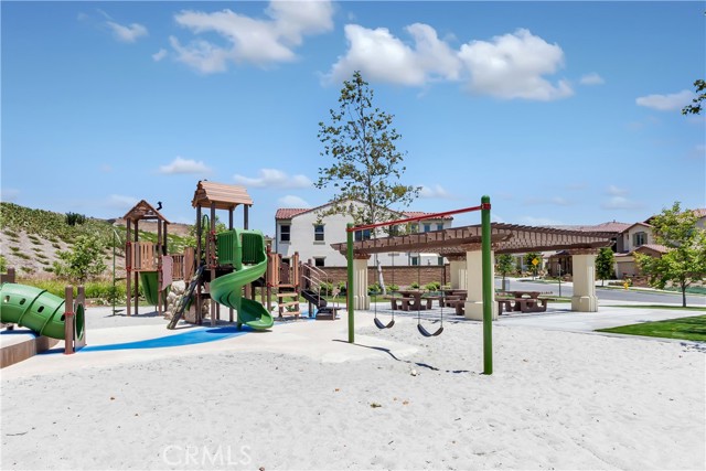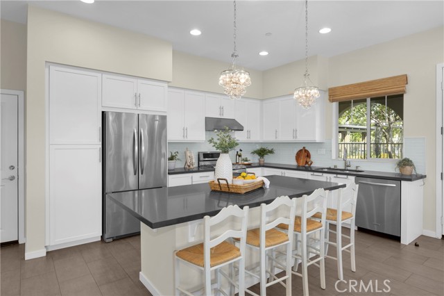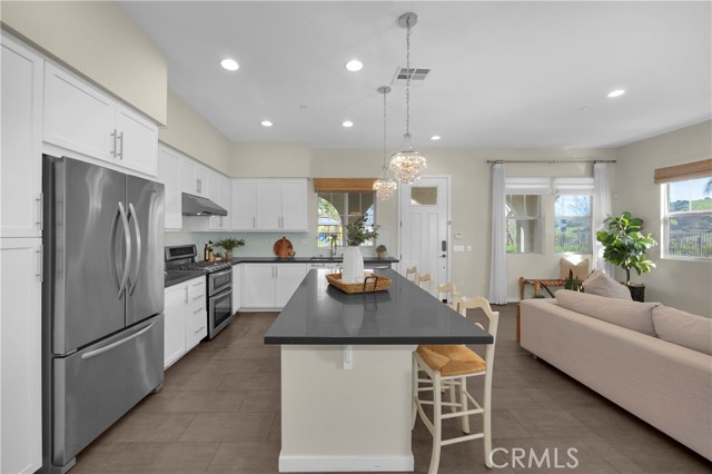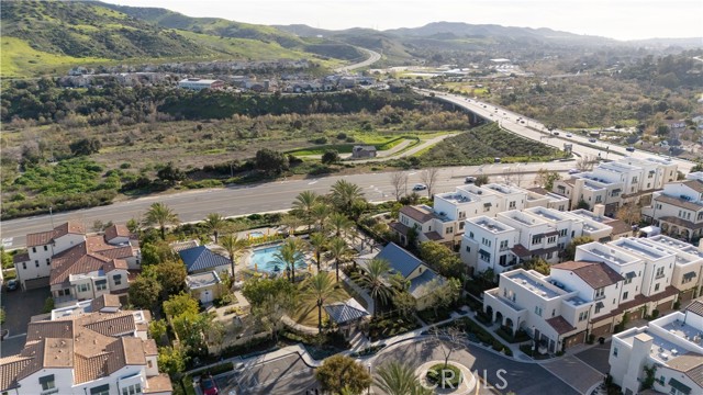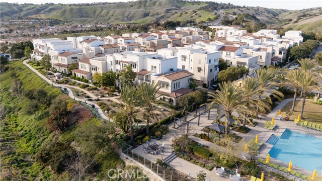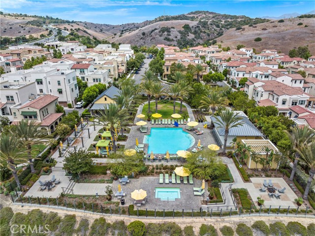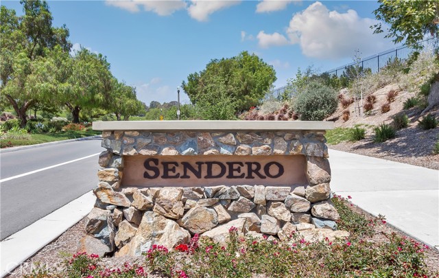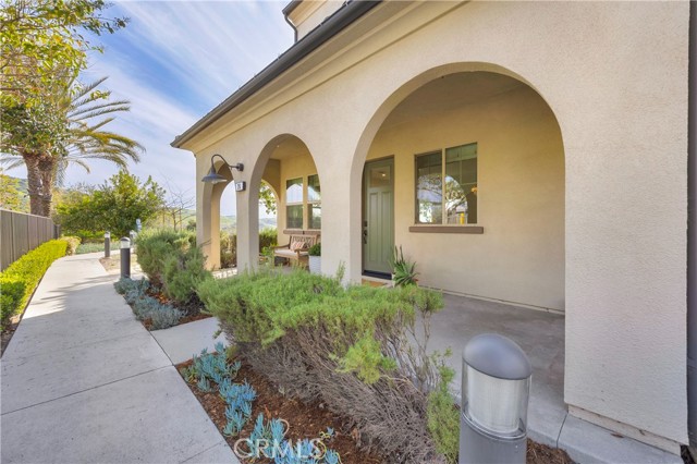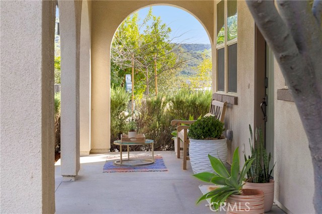 Perched on this elevated location in Sendero Lyon Cabanas, this FORMER MODEL HOME boasts panoramic views of the rolling hills, canyons and peekaboo ocean views allowing for cool breezes and gorgeous sunsets. Only attached on one wall, this 2 story property feels like a single family home. The kitchen includes gray quartz countertops and oversized island with seating for 4, white cabinetry with ample storage, glass subway tile backsplash, beautiful RH Glass pendants and stainless appliances including a 5-burner double oven range and full sized refrigerator. The adjacent great room is bathed in light from all of the windows that showcase the gorgeous view everywhere you look. Also access the large greenbelt in front of the house and take in the sunsets outside the single hung French Door just off the great room. Convenient powder bath with built-in cabinet with quartz counters completes the downstairs. This highly sought after floorplan boasts a spacious master suite with hillside and canyon views, large windows creating a light and airy feel and a large walk-in closet. An ensuite primary bath with dual sinks, quartz counters, custom backsplash and a step in tiled shower complete this primary sanctuary. The second level also features an office with wrap around built-in desk and cabinetry, generous secondary bedroom, secondary bath with quartz counter tops and tub/shower and upstairs laundry with included machines. Easy care oversized tile floors downstairs, plush carpet on the second level, recessed lighting in every room and custom woven grasscloth roman shades create a finished designer look. Attached 2 car garage with custom cabinets, built in workspace and epoxy floors round out this steal of a deal! Step onto the outdoor veranda providing plenty of space to relax, bbq or dine. Steps from the Outpost Pool with resort pool, jacuzzi spa, resort style bar, bocce courts, community clubhouse with full kitchen and BBQ patio. Live the resort lifestyle in this wonderful home with access to walking trails, 8 pools, workout gyms, arcade, firepits and more. Welcome Home!