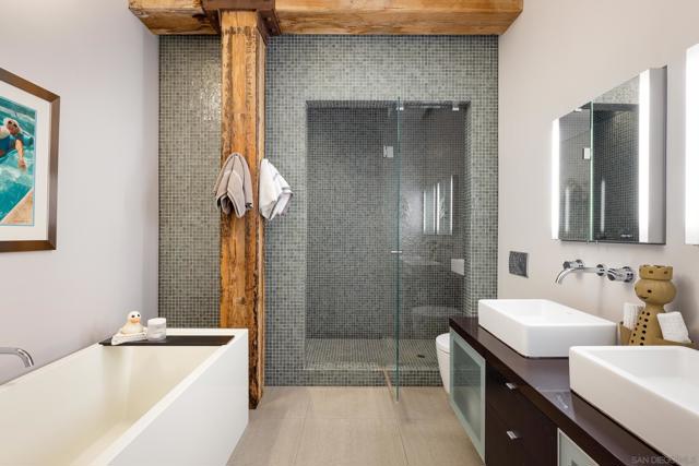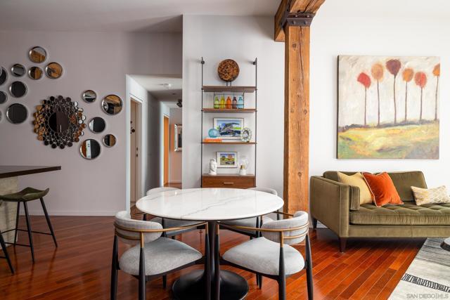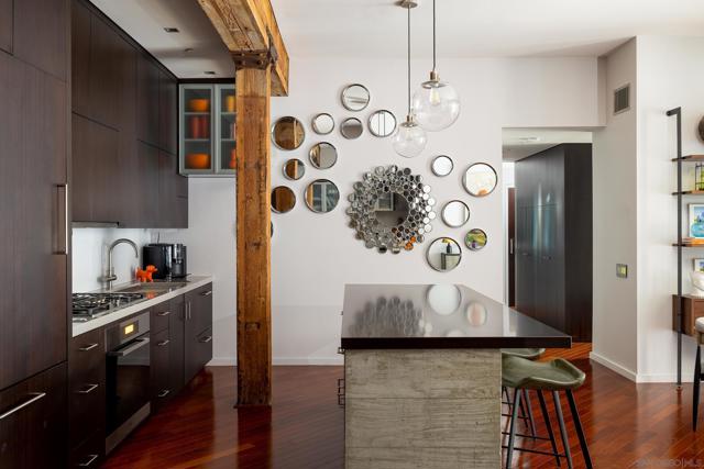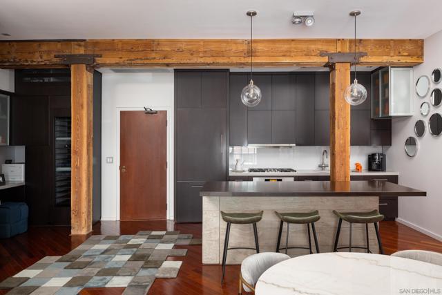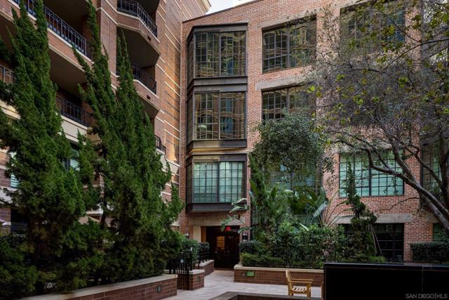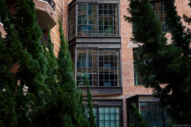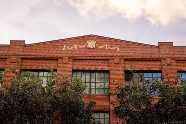Built in 1921, the Citrus / Pacific Soap Factory Building was designed by local San Diego architect William Wheeler. In 1993, architect Milford Wayne Donaldson completed CityFront Terrace. His design integrated a contemporary brick condominium building with the historic Citrus Soap Factory, making it one of the largest brick buildings on the West Coast. This loft residence is in the original, historically designated Soap Factory building, and is part of the Mills Act (which offers property tax incentives for historic preservation). The home features vaulted ceilings, hardwood flooring with original wood beams and brick accents throughout, an open kitchen with premium brand appliances and a reading nook in the second bedroom. Functional built-ins provide storage and working / desk space off the living room. The primary bedroom offers a spacious walk-in closet and a large bathroom with a separate bath & shower. The living room and both bedrooms have west-facing floor-to-ceiling iron-pane windows overlooking a lushly landscaped courtyard, known as the Urban Canyon, which hosts mature trees, vibrant greenery, and an artistic 90-foot water feature... The amenities at CityFront Terrace are resort-level, and the Soap Factory residences have the benefit of having everything right downstairs. From the jacuzzi and bbqs overlooking the 75-foot lap pool, to the entertaining suite with a full kitchen and bar for events and parties, a 3,500+ square foot fitness area with strength and cardio equipment, showers, saunas, and a workout studio, all of which share the historic aesthetic of the residences above. On the opposite side of the property, you will find an additional relaxing swimming pool and sundeck that lead out to a promenade with perfectly maintained landscaping. Additional conveniences include 2 assigned parking spaces with valet options, bike rooms, secure package and mail handling, and a 24-hour attended lobby with concierge services. You are just a few minutes' walk to San Diego Bay, Seaport Village, Pantoja Park, the Children's Museum and a number of restaurants and cafes, including Puesto, The Lion's Share, and Brickyard Coffee & Tea...