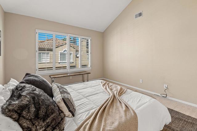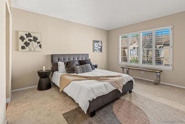 Tucked away at the end of a quiet cul-de-sac in the highly desirable Belsera community, this private 2-bedroom, 2-bath end unit offers the perfect blend of comfort, light, and lifestyle. With soaring ceilings and an open-concept design, the home feels bright and spacious from the moment you walk in, while its west-facing orientation helps keep the interior cooler during warmer months. The kitchen was updated in 2025 with refreshed quartz countertops, painted cabinetry, new sink and faucet, & upgraded lighting, opening seamlessly to the main living space ideal for both everyday living & entertaining. Additional improvements include fresh interior paint, brand new carpet, & a water heater and pressure regulator replaced in 2023. The bathroom was also upgraded in 2023 with new countertops, fixtures, glass shower doors, & a refinished tub, creating a clean & modern feel. Large windows bring in abundant natural light, while the elevated private balcony positioned above neighboring units offers a peaceful space to relax or host, overlooking greenspace and a seasonal creek during rainfall. Additional features include air conditioning, an attached one-car garage, a second assigned parking space, & in-unit washer and dryer. The home also benefits from a quiet setting, great neighbors, & a level of privacy that is hard to find. Residents of Belsera enjoy resort-style amenities including two swimming pools, picnic and BBQ areas, volleyball courts, scenic walking paths, and direct access to Mission Trails Regional Park—bringing an active, outdoor lifestyle right to your doorstep.