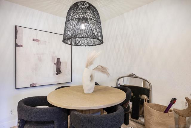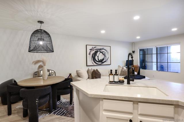 Welcome to a beautifully updated residence in the highly desirable Del Mar Villas community in Carmel Valley. Surrounded by lush, park-like landscaping, tranquil streams, and charming walking paths, this home offers a serene, resort-style living experience. Step inside to discover a bright, open-concept layout featuring modern finishes, wood-style flooring, and a seamless flow between the living, dining, and kitchen areas—perfect for both everyday living and entertaining. The kitchen showcases crisp white cabinetry, stainless steel appliances, and a functional breakfast bar that opens to the main living space. Residents of this sought-after community enjoy access to resort-style amenities including a pool, spa, fitness center, tennis courts, and clubhouse, all set within meticulously landscaped grounds. Conveniently located near top-rated schools, premier shopping, dining, and just minutes from the beach, this home offers the best of coastal San Diego living.