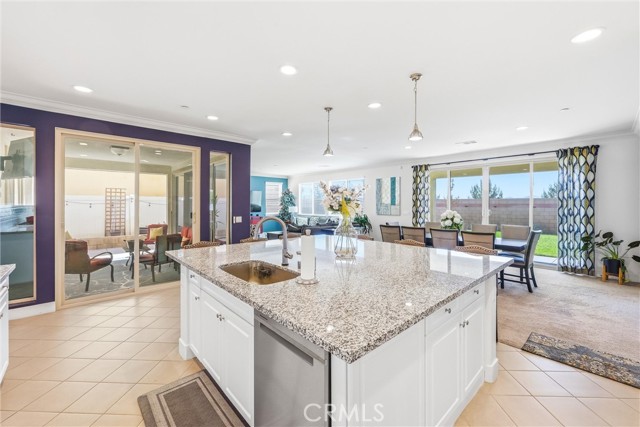 Welcome to 1619 Croton Street, a stunning Spanish Mediterranean two-story located in one of Beaumont's most desirable neighborhoods. The warm stucco facade, clay tile roof, and charming covered front porch create a welcoming first impression that carries through the front door. Step inside to a soaring two-story entry foyer bathed in natural light from transom windows above the elegant staircase. The main level is designed for the way families actually live, flowing seamlessly between a formal living room and a generous open-concept family room, giving everyone room to gather or find a quiet corner. Crown molding and recessed lighting add polished finishing touches throughout. The chef-worthy kitchen is the true heart of the home. A large granite island with seating for four anchors the space, surrounded by gleaming white cabinetry, subway tile backsplash, stainless steel appliances, including a built-in double oven and refrigerator, and pendant lighting that sets the perfect mood. The dining area sits just beyond, with sliding glass doors opening directly to the covered back patio for effortless indoor-outdoor entertaining. A dedicated home office, a full bathroom, and a comfortable bedroom on the main floor make this layout exceptionally versatile, perfect for guests, in-laws, or a quiet work-from-home setup. Upstairs, a spacious loft offers endless possibilities as a media room, playroom, study space, or second family room. The primary suite is a true retreat. A private balcony frames breathtaking mountain and valley views, while the spa-inspired en-suite features dual vanities with a dedicated makeup station, a deep-soaking tub, a glass-enclosed shower, and generous storage. Three additional well-sized bedrooms with scenic views and plush carpet share two full bathrooms, each with dual sinks and clean white finishes. Thoughtful upgrades include a whole-home water softener, leased solar panels to reduce utility costs, and an epoxy-finished garage floor. The covered front porch and back patio make outdoor living a year-round pleasure under the beautiful skies of the Inland Empire. The HOA offers an impressive lineup of resort-style amenities, including three pools, three spas, two BBQ areas, a playground, a basketball court, and a bocce court. With this much to enjoy just steps from home, every day feels like a getaway. Conveniently located minutes from top-rated schools, shopping, dining, and the I-10 freeway.