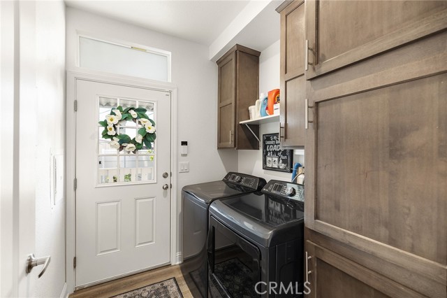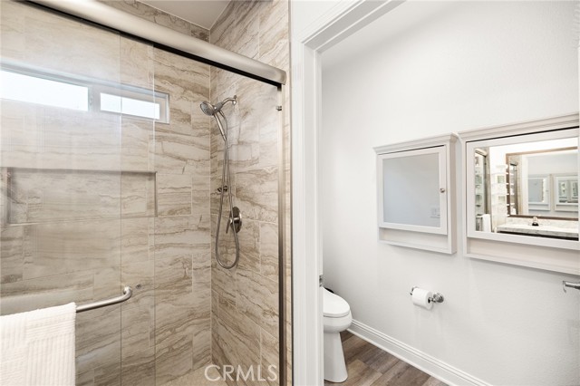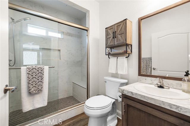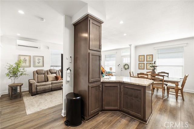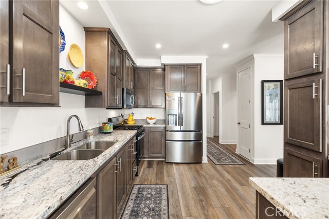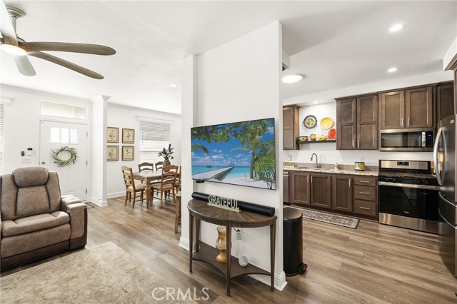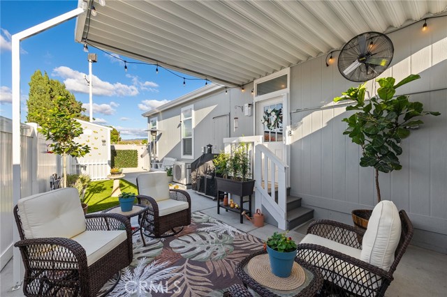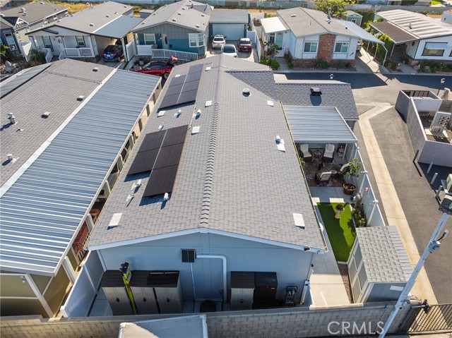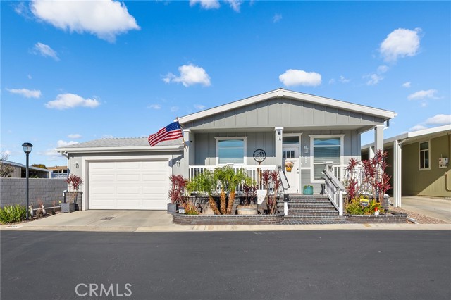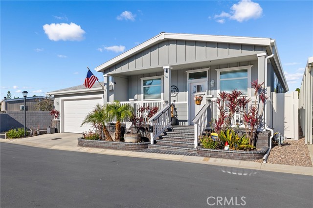 Welcome to this stunning 2022 Fleetwood Canyon Lake double-wide in the highly sought-after 55+ community of Santiago Creek Orange Estates. This meticulously upgraded home offers 2 bedrooms, 2 bathrooms and 1,440 sq ft of thoughtfully designed living space. The current owners, the only owners of this home, spared no expense with over $92,000 in upgrades including 12 fully paid owned Tesla solar panels with Powerwall battery backup, a brand new 50-year roof, premium dual-pane low-e windows, 3 mini-split heating and cooling units, waterproof luxury vinyl plank flooring throughout, and a whole-house LifeSource 1620 water filtration system. The kitchen features quartz countertops, new cabinetry and stainless steel appliances. Both bathrooms showcase glass tile walk-in showers. Nine foot ceilings, crown molding, custom baseboards, LED recessed lighting and custom faux blinds throughout give this home a high-end custom feel well beyond its price point. Oversized ceiling fans in every room and an automatic roof ventilation fan add year-round comfort. Additional highlights include a SimpliSafe alarm system covering all entry points and perimeter, premium custom interior and exterior paint, a drywalled finished garage with EV charging station, and a Tuff Shed that conveys with the sale. Enjoy outdoor living under the covered patio sitting area. This is a rare opportunity to own a like-new home loaded with premium upgrades in one of Orange's most desirable 55+ communities.