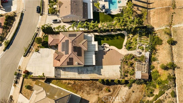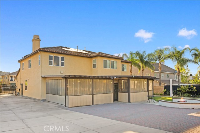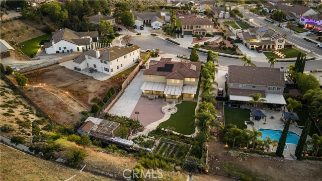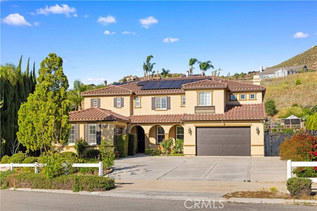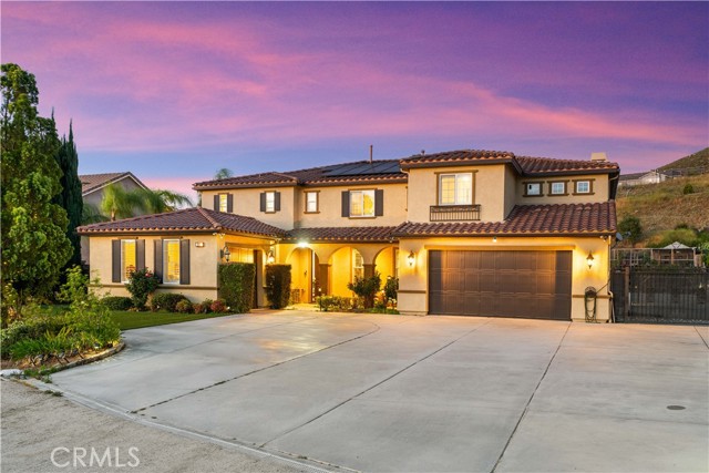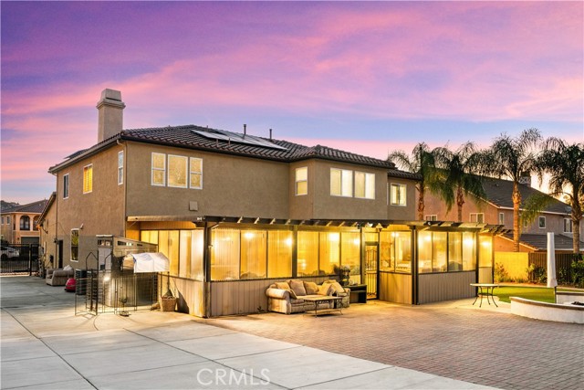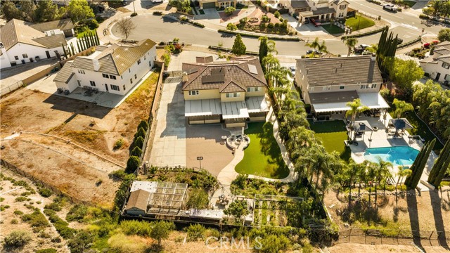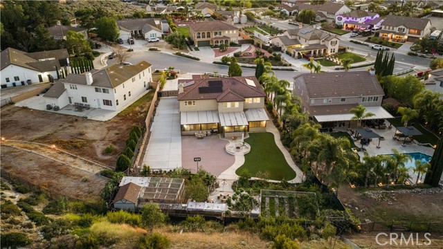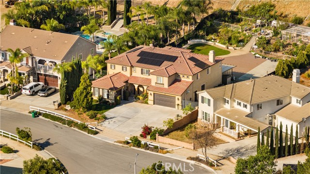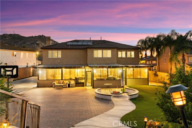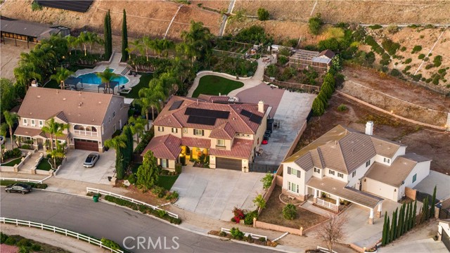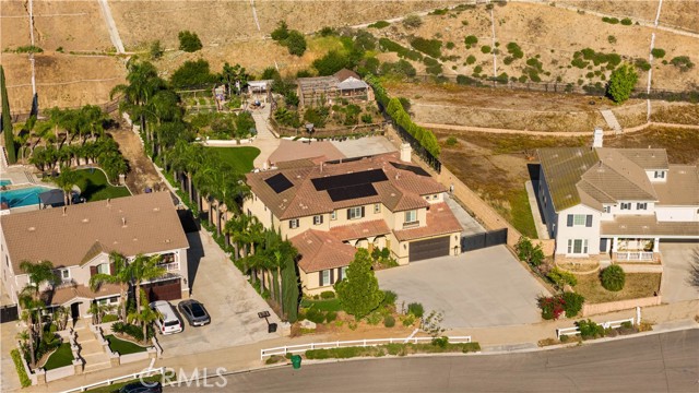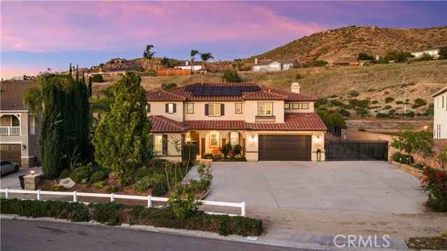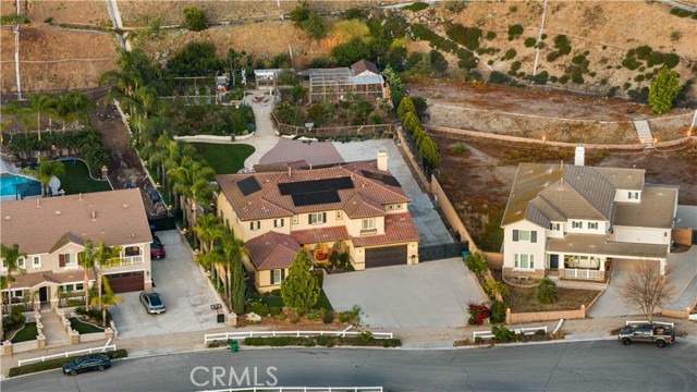 Located in the sought-after Norco Ridge Estates community in Norco, this expansive Plan 5 residence offers approximately 4,749 square feet of well-designed living space on a generous 33,976 square foot lot, with sweeping mountain and neighborhood views that define the Norco Hills setting. The home offers a total of 8 rooms and 8 full bathrooms, providing exceptional flexibility for a variety of living arrangements, including additional bedrooms, home offices, gyms, or creative spaces. A grand entry with a wrought iron staircase leads into formal living and dining areas, accented by dark wood flooring. The kitchen is designed for both everyday use and entertaining, with granite countertops, a large center island, abundant cabinetry, and a full suite of KitchenAid stainless steel appliances, including a 6-burner cooktop, double ovens, warming drawer, and trash compactor. Extending from the spacious family room is a fully enclosed sunroom with a built-in kitchen, creating additional usable interior space ideal for gatherings and year-round enjoyment. Additional interior highlights include office with custom built-in desk and cabinetry, a large upstairs bonus room, plantation shutters, and a well-equipped laundry room with storage upstairs, along with a secondary laundry setup in the garage for added convenience. The primary suite offers a private retreat with dual walk-in closets, and a bathroom featuring a soaking tub, separate shower, and detailed finishes throughout. The oversized backyard is designed for both relaxation and entertaining, featuring a fire pit, and multiple activity areas including a putting green, basketball court, and horseshoe pit. An elevated gazebo patio provides an additional vantage point to take in the surrounding views. Over $200,000+ has been invested in upgrades and improvements throughout the property, including a fully paid 32-panel solar system, upgraded 220V electrical in both the garage and yard, a soft water system, and drinking water filtration systems in both kitchens. Additional features include gated RV parking, a 4-car garage, and a cul-de-sac location that offers both space and privacy. A well-rounded property that combines size, flexibility, and scenic surroundings in one of Norco’s premier neighborhoods.