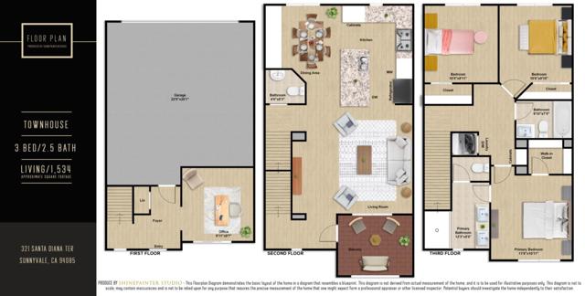 Gorgeous, recently updated townhome in Sunnyvale's vibrant heart! This 2015 built home enjoys an open and versatile floor plan. The ground floor features a bright office with access to outside and a half bath. Upstairs, the open-concept living/kitchen area with brand-new flooring is perfect for gatherings. The modern kitchen offers quality white cabinetry, quartz counters, stainless-steel appliances, and a center island with breakfast bar. Brand-new light fixtures can be seen in the dining area, kitchen island, living room, and all bathrooms, adding to the modern feel along with the brand-new interior wall painting. Step out onto the private patio for quintessential indoor/outdoor living. The top floor features a generously sized master suite with walk-in closet. Other features include central AC, double-pane windows, in-unit laundry, and a 2-car garage. Centrally located, close to parks, shopping, dining, Caltrain, and downtown Sunnyvale, just 5 minutes walk to Apple Campus, with quick access to Central Expy/Lawrence Expy / 101/237 Hwy, short drive to Google, Apple, Amazon, Nvidia, and other tech companies.