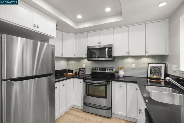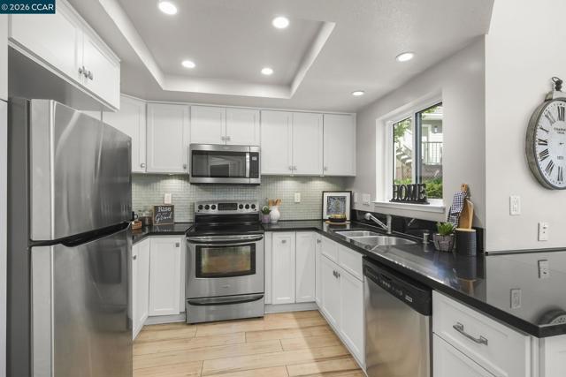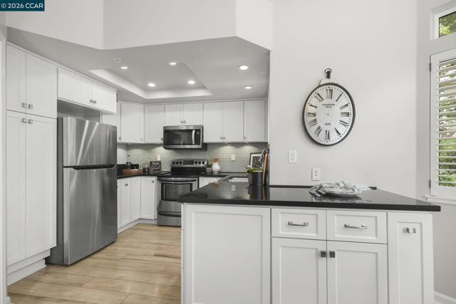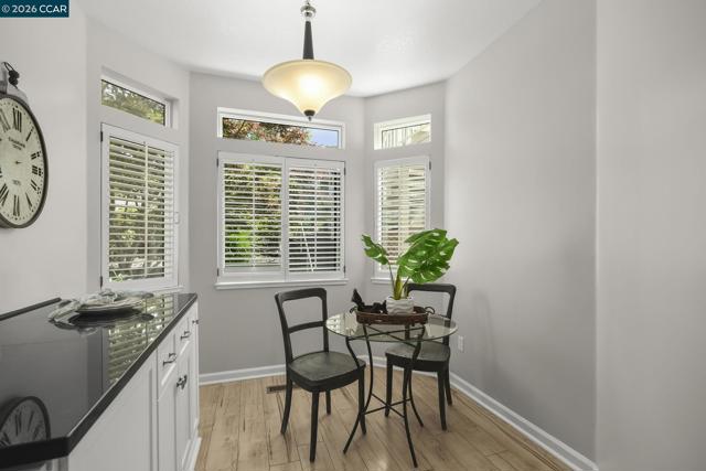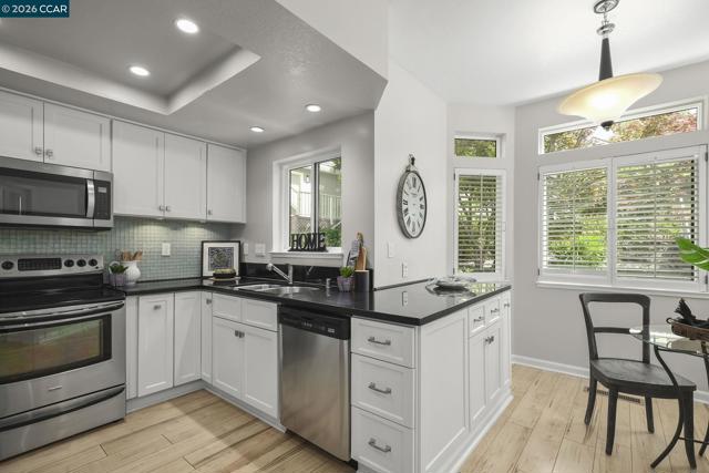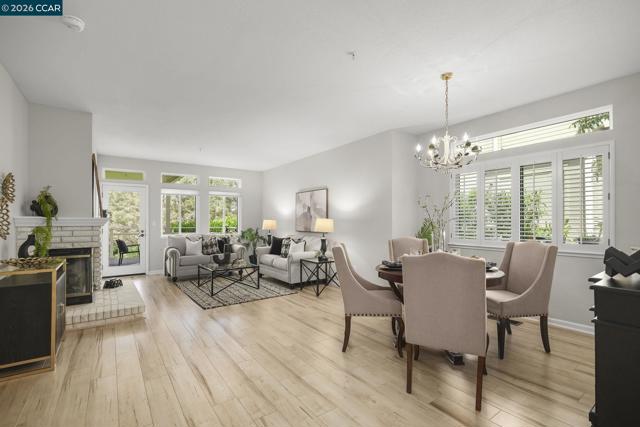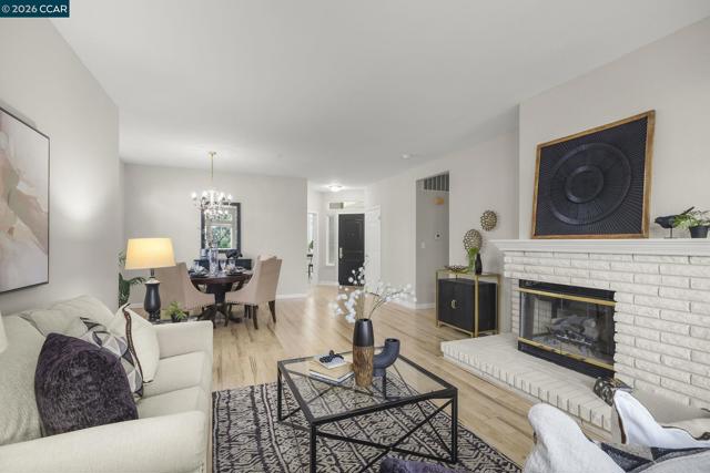 Gorgeous Aberdeen model at highly desirable Rossmoor Greens with a spectacular setting overlooking golf course. Totally updated to perfection with remodeled kitchen with recessed lighting and cozy breakfast nook. Smooth ceilings, dual pane windows, custom window coverings, hard surface plank flooring, gas fireplace, and new carpets in both bedrooms. Large open patio with direct view of golf course and tennis courts. A Stunning Setting!